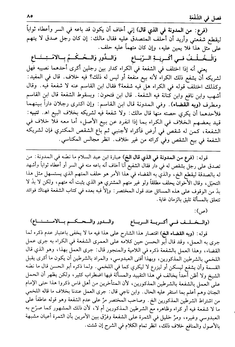 والخلف في أكرية الرباع والدور والحكم بالامتناع يعني أنه اختلف في الشفعة في الكراء كدار بين رجلين أكرى أحدهما نصيبه فهل لشريكه أن يشفع ذلك الكراء لأنه بيع منفعة أو ليس له ذلك فيه خلاف