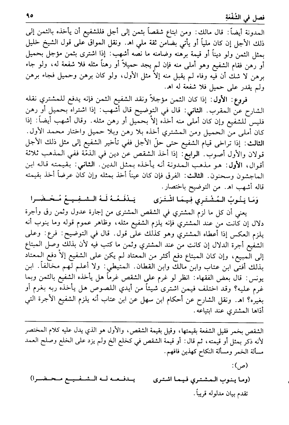 المدونة أيضا قال مالك ومن ابتاع شقصا بثمن إلى أجل فللشفيع أن يأخذه بالثمن إلى ذلك الأجل إن كان مليا أو يأتي بضامن ثقة ملي ا هـ ونقل المواق على قول الشيخ خليل بمثل الثمن ولو دينا أو قيمة برهنه وضامنه ما نصه أشهب إذا اشترى بثمن مؤجل بحميل أو رهن فقام الشفيع وهو أملى منه فإن لم يجد حميلا أو رهنا مثله فلا شفعة له ولو جاء برهن لا شك أن فيه وفاء لم يقبل منه إلا مثل الأول ولو كان برهن وحميل فجاء برهن ولم يقدر على حميل فلا شفعة له ا هـ
