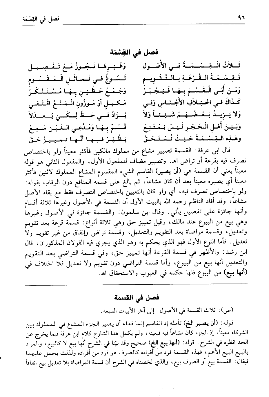 فصل في القسمة ثلاث القسمة في الأصول وغيرها تجوز مع تفصيل فقسمة القرعة بالتقويم تسوغ في تماثل المقسوم ومن أبى القسم بها فيجبر وجمع حظين بها مستنكر كذاك في اختلاف الأجناس وفي مكيل أو موزون المنع اقتفي ولا يزيد بعضهم شيئا ولا يزاد في حظ لكي يعدلا وبين أهل الحجر ليس يمتنع قسم بها ومدعي الغبن سمع وهذه القسمة حيث تستحق يظهر فيها أنها تمييز حق قال ابن عرفة القسمة تصيير مشاع من مملوك مالكين فأكثر معينا ولو باختصاص تصرف فيه بقرعة أو تراض ا هـ