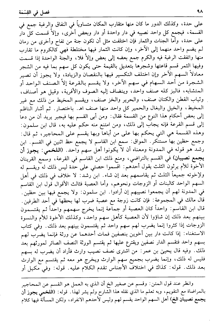 وأما العصبة فثالث الأقوال قول ابن القاسم في المدونة لهم أن يجمعوا نصيبهم إن أرادوا ابن سلمون ولا يجمع فيها بين حظين قال مالك في المجموعة فإن كانت زوجة مع عصبة ضرب لها بحظها في أحد الطرفين قال ابن القاسم واحدا كان العصبة أو جماعة إنما يخرج سهمهم واحدا ثم يقتسمون بينهم بعد ذلك إن شاؤوا لأن العصبة كأهل سهم واحد وكذلك الإخوة للأم والنسوة الزوجات إذا كثروا إنما يضرب لهم سهم واحد ثم يقتسمون بينهم بعد ذلك وفي كتاب الاستغناء إذا كانت دار بين أخوين بنصفين فمات أحدهما عن ورثة فإنما يضرب لهم بسهم واحد فتقسم الدار نصفين ويقترع عليها ثم يقتسم الورثة النصف الصائر لمورثهم بعد ذلك وفيه قال يحيى بن عمر من اشترى نصف نصيب وارث فأراد أن يضرب له بسهم فليس له ذلك وإنما يضرب بجميع سهم الوارث ويخرج هو معه ثم يقتسم مع الوارث بعد ذلك قوله كذاك في اختلاف الأجناس تقدم الكلام عليه قوله وفي مكيل أو