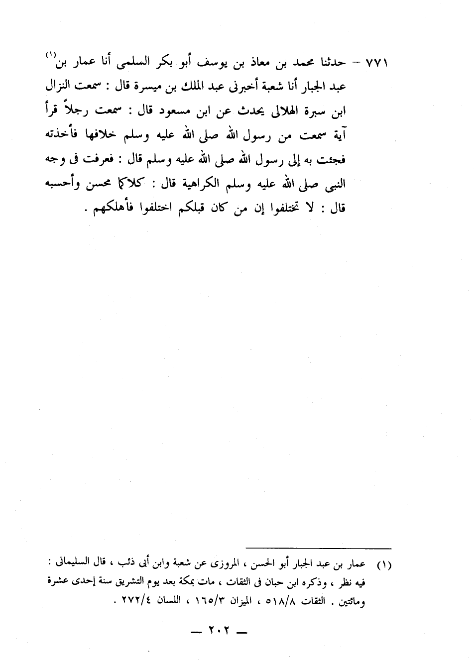 771 - حَدَّثَنَا مُحَمَّدُ بْنُ مُعَاذِ بْنِ يُوسُفَ أَبُو بَكْرٍ السُّلَمِيُّ، أنا عَمَّارُ بْنُ عَبْدِ الْجَبَّارِ، أنا شُعْبَةُ، أَخْبَرَنِي عَبْدُ الْمَلِكِ بْنُ مَيْسَرَةَ قَالَ: سَمِعْتُ النَّزَّالَ بْنَ سَبْرَةَ الْهِلَالِيَّ، يُحَدِّثُ، عَنِ ابْنِ مَسْعُودٍ قَالَ: سَمِعْتُ رَجُلًا قَرَأَ آيَةً، سَمِعْتُ مِنْ رَسُولِ اللَّهِ صَلَّى اللهُ عَلَيْهِ وَسَلَّمَ خِلَافَهَا، فَأَخَذْتُهُ فَجِئْتُ بِهِ إِلَى رَسُولِ اللَّهِ صَلَّى اللهُ عَلَيْهِ وَسَلَّمَ قَالَ: فَعَرَفْتُ فِي وَجْهِ النَّبِيِّ صَلَّى اللهُ عَلَيْهِ وَسَلَّمَ الْكَرَاهِيَةَ قَالَ: «كِلَاكُمَا مُحْسِنٌ» ، وَأَحْسَبُهُ قَالَ: «لَا تَخْتَلِفُوا؛ إِنَّ §مَنْ كَانَ قَبْلَكُمُ اخْتَلَفُوا فَأَهْلَكَهُمْ»