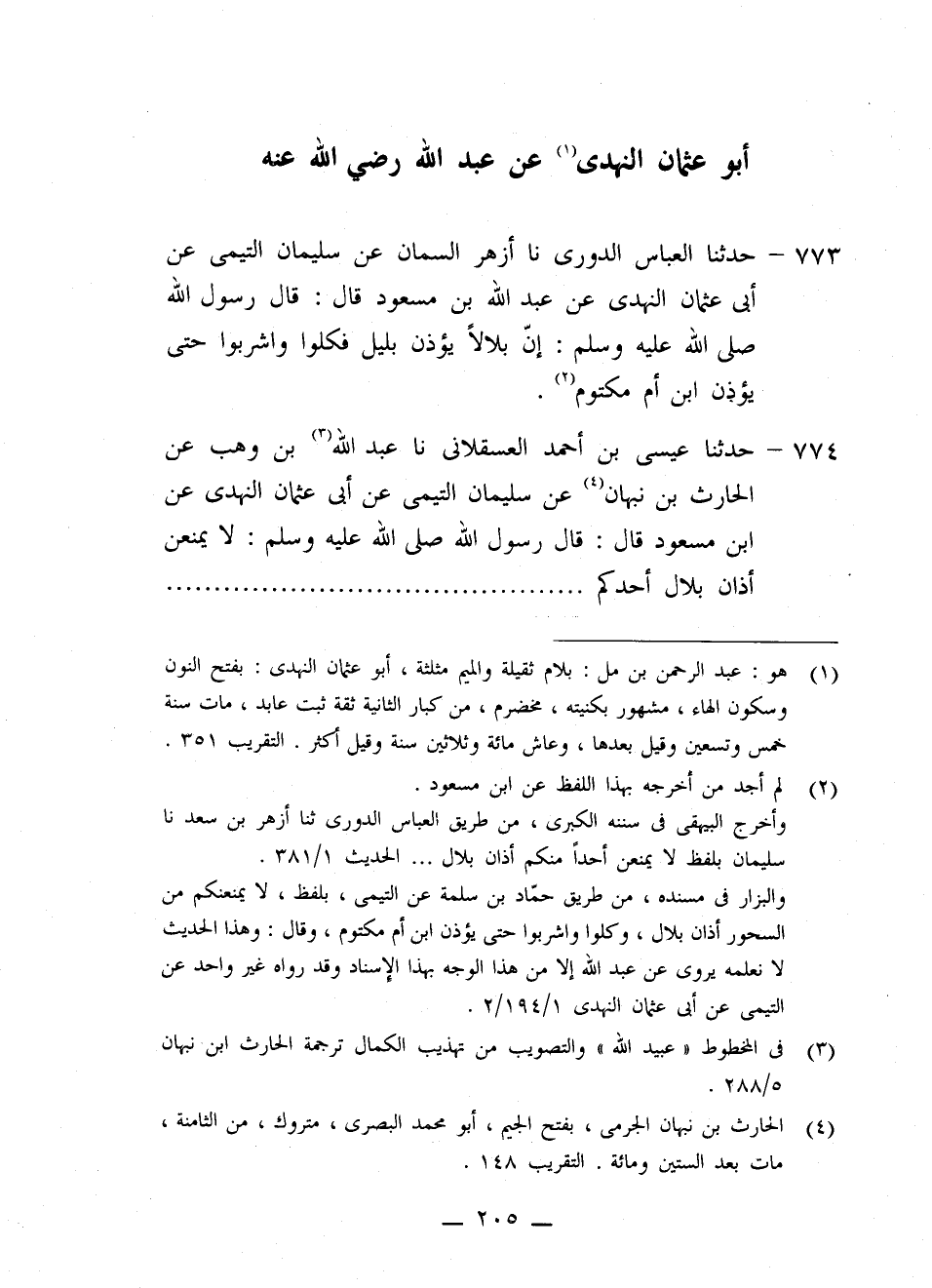 773 - حَدَّثَنَا الْعَبَّاسُ الدُّورِيُّ، نا أَزْهَرُ السَّمَّانُ، عَنْ سُلَيْمَانَ التَّيْمِيُّ، عَنْ أَبِي عُثْمَانَ النَّهْدِيُّ، عَنْ عَبْدِ اللَّهِ بْنِ مَسْعُودٍ قَالَ: قَالَ رَسُولُ اللَّهِ صَلَّى اللهُ عَلَيْهِ وَسَلَّمَ: «إِنَّ §بِلَالًا يُؤَذِّنُ بِلَيْلٍ، فَكُلُوا وَاشْرَبُوا حَتَّى يُؤَذِّنَ ابْنُ أُمِّ مَكْتُومٍ»