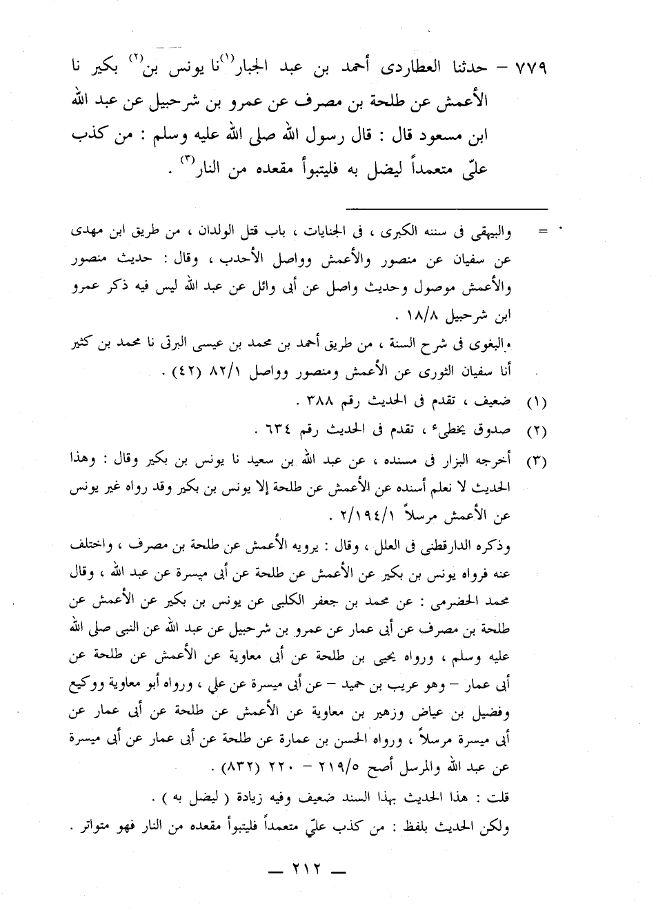 779 - حَدَّثَنَا الْعُطَارِدِيُّ أَحْمَدُ بْنُ عَبْدِ الْجَبَّارِ، نا يُونُسُ بْنُ بُكَيْرٍ، نا الْأَعْمَشُ، عَنْ طَلْحَةَ بْنِ مُصَرِّفٍ، عَنْ عَمْرِو بْنِ شُرَحْبِيلَ، عَنْ عَبْدِ اللَّهِ بْنِ مَسْعُودٍ قَالَ: قَالَ رَسُولُ اللَّهِ صَلَّى اللهُ عَلَيْهِ وَسَلَّمَ: «§مَنْ كَذَبَ عَلَيَّ مُتَعَمِّدًا؛ لِيُضِلَّ بِهِ فَلْيَتَبَوَّأْ مَقْعَدَهُ مِنَ النَّارِ»