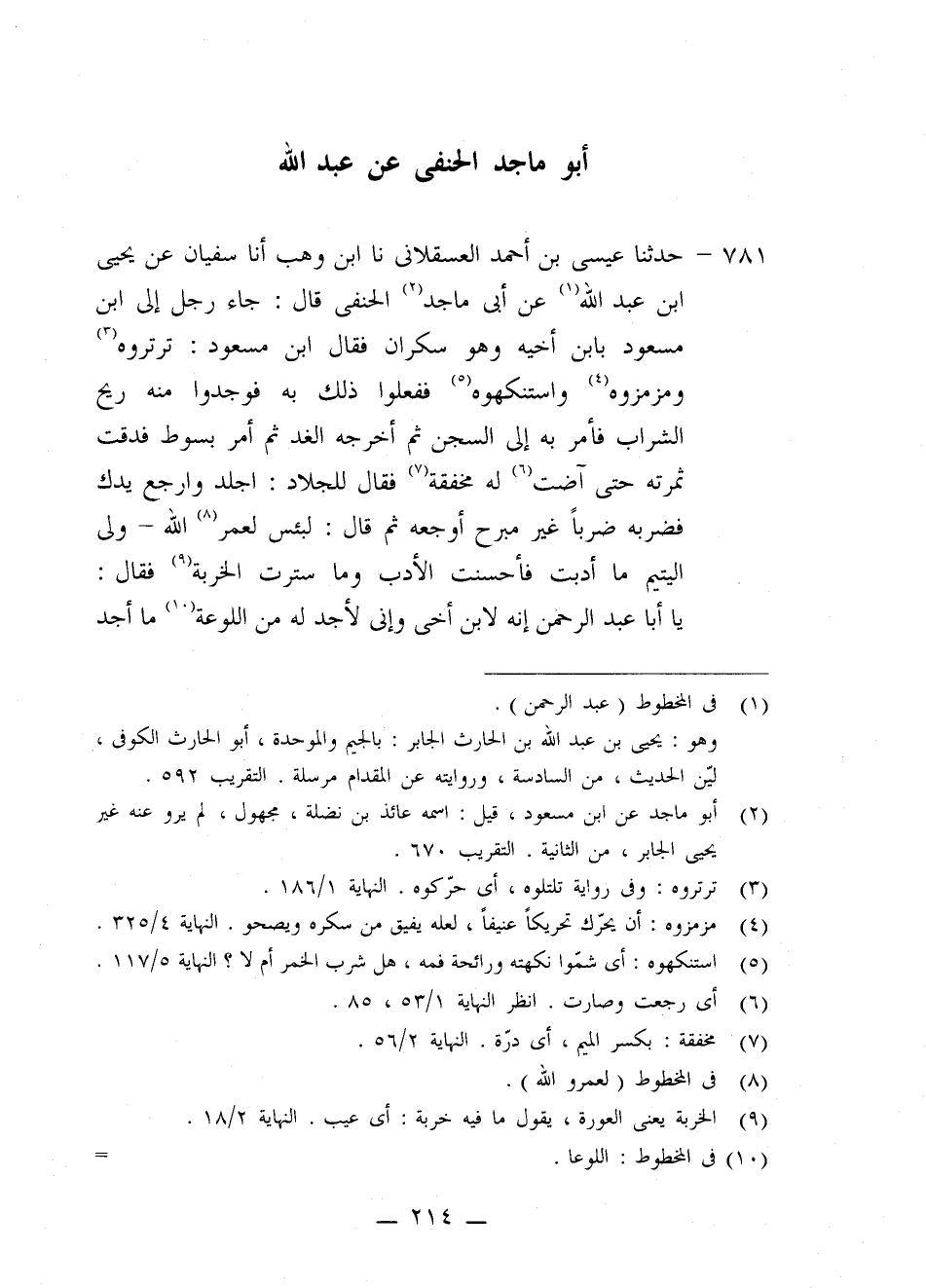 781 - حَدَّثَنَا عِيسَى بْنُ أَحْمَدَ الْعَسْقَلَانِيُّ، نا ابْنُ وَهْبٍ، أنا سُفْيَانُ، عَنْ يَحْيَى بْنِ عَبْدِ اللَّهِ، عَنْ أَبِي مَاجِدٍ الْحَنَفِيِّ قَالَ: جَاءَ رَجُلٌ إِلَى ابْنِ مَسْعُودٍ بِابْنِ أَخِيهِ وَهُوَ سَكْرَانُ، فَقَالَ ابْنُ مَسْعُودٍ: تَرْتِرُوهُ وَمَزْمِزُوهُ وَاسْتَنْكِهُوهُ، فَفَعَلُوا ذَلِكَ بِهِ، فَوَجَدُوا مِنْهُ رِيحَ الشَّرَابِ، فَأَمَرَ بِهِ إِلَى السِّجْنِ، ثُمَّ أَخْرَجَهُ الْغَدَ، ثُمَّ أَمَرَ بِسَوْطٍ فَدُقَّتْ ثَمَرَتُهُ حَتَّى آضَتْ لَهُ مِخْفَقَةٌ، فَقَالَ لِلْجَلَّادِ: اجْلِدْ وَارْجِعْ يَدَكَ، فَضَرَبَهُ ضَرْبًا غَيْرَ مُبَرِّحٍ أَوْجَعَهُ، ثُمَّ قَالَ: لَبِئْسَ ـ لَعَمْرُ اللَّهِ ـ وَلِيُّ الْيَتِيمِ؛ مَا أَدَّبْتَ فَأَحْسَنْتَ الْأَدَبَ، وَمَا سَتَرْتَ الْخَرَبَةَ، فَقَالَ: يَا أَبَا عَبْدِ الرَّحْمَنِ، إِنَّهُ لَابْنُ أَخِي، وَإِنِّي لَأَجِدُ لَهُ مِنَ اللَّوْعَةِ مَا أَجِدُ -[215]- لِوَلَدِي، وَلَكِنْ لَمْ أَلْهُ، فَقَالَ ابْنُ مَسْعُودٍ: إِنَّ اللَّهَ عَفُوٌّ يُحِبُّ الْعَفْوَ، وَإِنَّهُ لَا يَنْبَغِي لِوَالِي أَمْرٍ أَنْ يُؤْتَى بِحَدٍّ إِلَّا أَقَامَهُ، ثُمَّ أَنْشَأَ يُحَدِّثُ عَنْ رَسُولِ اللَّهِ صَلَّى اللهُ عَلَيْهِ وَسَلَّمَ، فَقَالَ: أَوَّلُ رَجُلٍ مِنَ الْمُسْلِمِينَ سَرَقَ، فَقِيلَ: يَا رَسُولَ اللَّهِ، إِنَّ هَذَا سَرَقَ، فَكَأَنَّمَا أَسَفَّ وَجْهُ رَسُولِ اللَّهِ صَلَّى اللهُ عَلَيْهِ وَسَلَّمَ رَمَادًا، فَقَالَ رَجُلٌ مِنْ أَصْحَابِهِ: يَا رَسُولَ اللَّهِ، هَذَا كَأَنَّهُ شَقَّ عَلَيْكَ قَالَ: «§وَمَا يَمْنَعُنِي وَأَنْتُمْ أَعْوَانُ الشَّيْطَانِ، وَاللَّهُ عَفُوٌّ يُحِبُّ الْعَفْوَ، لَا يَنْبَغِي لِوَالِي أَمْرٍ أَنْ يُؤْتَى بِحَدٍّ إِلَّا أَقَامَهُ» ، ثُمَّ قَرَأَ {وَلْيَعْفُوا وَلْيَصْفَحُوا أَلَا تُحِبُّونَ أَنْ يَغْفِرَ اللَّهُ لَكُمْ وَاللَّهُ غَفُورٌ رَحِيمٌ} [النور: 22]