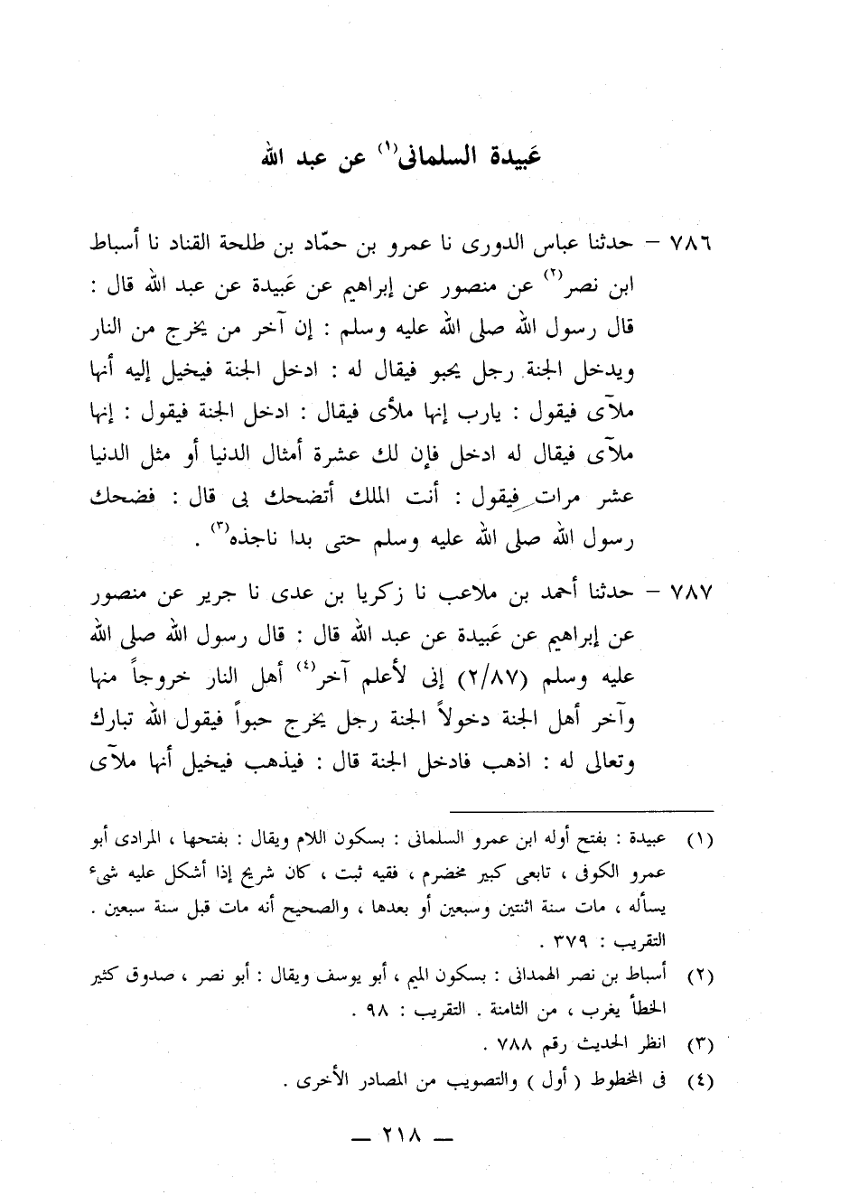 786 - حَدَّثَنَا عَبَّاسٌ الدُّورِيُّ، نا عَمْرُو بْنُ حَمَّادِ بْنِ طَلْحَةَ الْقَنَّادُ، نا أَسْبَاطُ بْنُ نَصْرٍ، عَنْ مَنْصُورٍ، عَنْ إِبْرَاهِيمَ، عَنْ عَبِيدَةَ، عَنْ عَبْدِ اللَّهِ قَالَ: قَالَ رَسُولُ اللَّهِ صَلَّى اللهُ عَلَيْهِ وَسَلَّمَ: " إِنَّ §آخِرَ مَنْ يَخْرُجُ مِنَ النَّارِ وَيَدْخُلُ الْجَنَّةَ رَجُلٌ يَحْبُو فَيُقَالُ لَهُ: ادْخُلِ الْجَنَّةَ، فَيُخَيَّلُ إِلَيْهِ أَنَّهَا مَلْأَى، فَيَقُولُ: يَا رَبِّ، إِنَّهَا مَلْأَى، فَيُقَالُ: ادْخُلِ الْجَنَّةَ، فَيَقُولُ: إِنَّهَا مَلْأَى، فَيُقَالُ لَهُ: ادْخُلْ، فَإِنَّ لَكَ عَشَرَةَ أَمْثَالِ الدُّنْيَا أَوْ مِثْلَ الدُّنْيَا عَشْرَ مَرَّاتٍ، فَيَقُولُ: أَنْتَ الْمَلِكُ، أَتَضْحَكُ بِي؟ " قَالَ: فَضَحِكَ رَسُولُ اللَّهِ صَلَّى اللهُ عَلَيْهِ وَسَلَّمَ حَتَّى بَدَا نَاجِذُهُ "