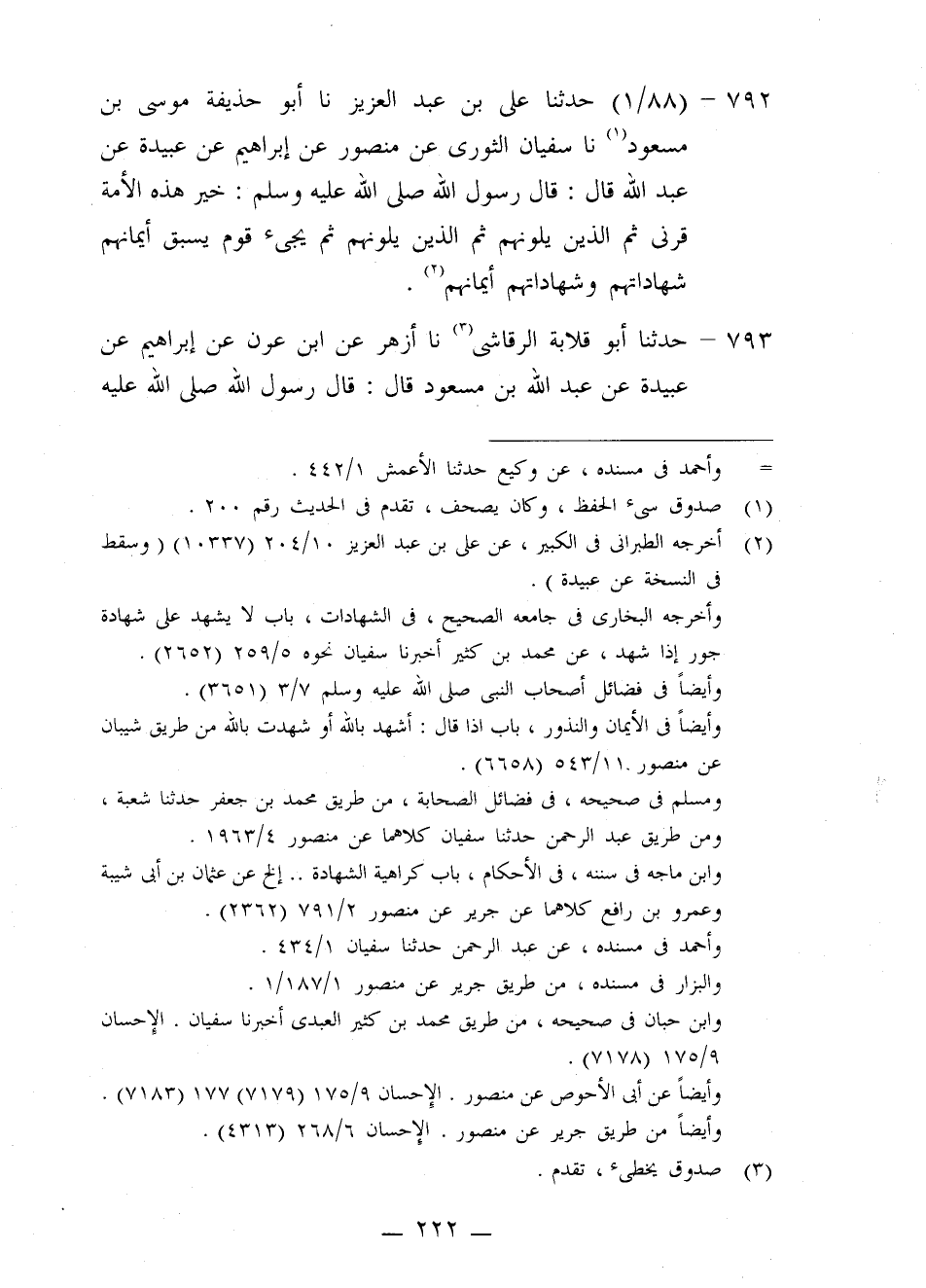 792 - حَدَّثَنَا عَلِيُّ بْنُ عَبْدِ الْعَزِيزِ، نا أَبُو حُذَيْفَةَ مُوسَى بْنُ مَسْعُودٍ، نا سُفْيَانُ الثَّوْرِيُّ، عَنْ مَنْصُورٍ، عَنْ إِبْرَاهِيمَ، عَنْ عَبِيدَةَ، عَنْ عَبْدِ اللَّهِ قَالَ: قَالَ رَسُولُ اللَّهِ صَلَّى اللهُ عَلَيْهِ وَسَلَّمَ: «§خَيْرُ هَذِهِ الْأُمَّةِ قَرْنِي، ثُمَّ الَّذِينَ يَلُونَهُمْ، ثُمَّ الَّذِينَ يَلُونَهُمْ، ثُمَّ يَجِيءُ قَوْمٌ يَسْبِقُ أَيْمَانُهُمْ شَهَادَاتِهِمْ، وَشَهَادَاتُهُمْ أَيْمَانَهُمْ»