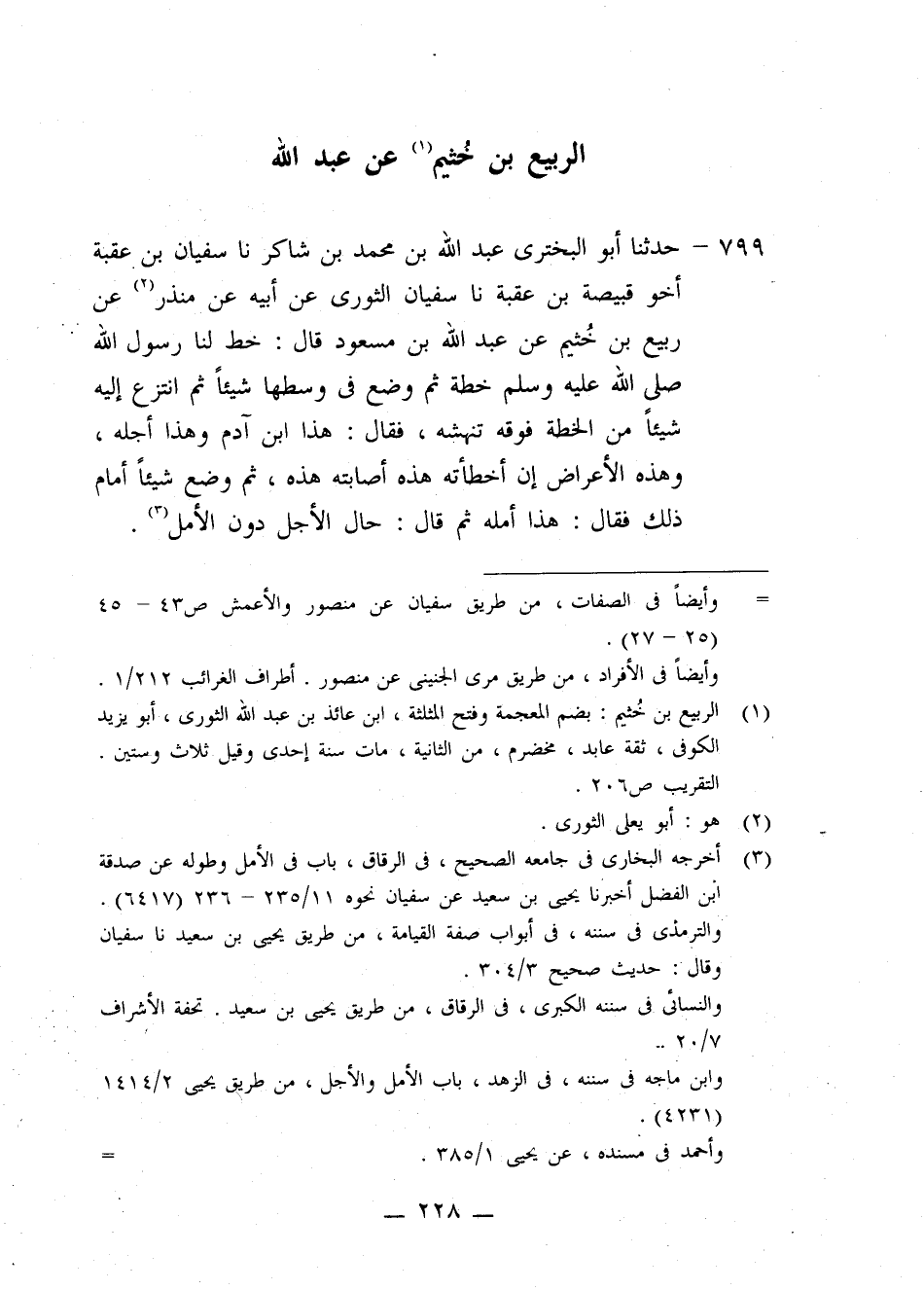 799 - حَدَّثَنَا أَبُو الْبَخْتَرِيِّ عَبْدُ اللَّهِ بْنُ مُحَمَّدِ بْنِ شَاكِرٍ، نا سُفْيَانُ بْنُ عُقْبَةَ أَخُو قَبِيصَةَ بْنِ عُقْبَةَ، نا سُفْيَانُ الثَّوْرِيُّ، عَنْ أَبِيهِ، عَنْ مُنْذِرٍ، عَنْ رَبِيعِ بْنِ خُثَيْمٍ، عَنْ عَبْدِ اللَّهِ بْنِ مَسْعُودٍ قَالَ: خَطَّ لَنَا رَسُولُ اللَّهِ صَلَّى اللهُ عَلَيْهِ وَسَلَّمَ خُطَّةً، ثُمَّ وَضَعَ فِي وَسَطِهَا شَيْئًا، ثُمَّ انْتَزَعَ إِلَيْهِ شَيْئًا مِنَ الْخُطَّةِ فَوْقَهُ تَنْهَشُهُ، فَقَالَ: «§هَذَا ابْنُ آدَمَ، وَهَذَا أَجَلُهُ، وَهَذِهِ الْأَعْرَاضُ إِنْ أَخْطَأَتْهُ هَذِهِ أَصَابَتْهُ هَذِهِ» ، ثُمَّ وَضَعَ شَيْئًا أَمَامَ ذَلِكَ، فَقَالَ: «هَذَا أَمَلُهُ» ، ثُمَّ قَالَ: «حَالَ الْأَجَلُ دُونَ الْأَمَلِ»