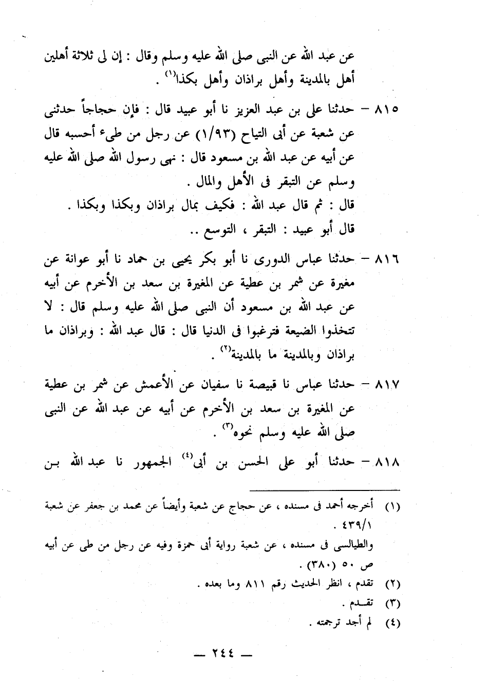 815 - حَدَّثَنَا عَلِيُّ بْنُ عَبْدِ الْعَزِيزِ، نا أَبُو عُبَيْدٍ قَالَ: فَإِنَّ حَجَّاجًا حَدَّثَنِي، عَنْ شُعْبَةَ، عَنْ أَبِي التَّيَّاحِ، عَنْ رَجُلٍ مِنْ طَيِّئٍ، أَحْسَبُهُ قَالَ: عَنْ أَبِيهِ، عَنْ عَبْدِ اللَّهِ بْنِ مَسْعُودٍ قَالَ: §نَهَى رَسُولُ اللَّهِ صَلَّى اللهُ عَلَيْهِ وَسَلَّمَ عَنِ التَّبَقُّرِ فِي الْأَهْلِ وَالْمَالِ ". قَالَ: ثُمَّ قَالَ عَبْدُ اللَّهِ: فَكَيْفَ بِمَالٍ بِرَاذَانَ، وَبِكَذَا وَبِكَذَا؟ قَالَ أَبُو عُبَيْدٍ: التَّبَقُّرُ التَّوَسُّعُ