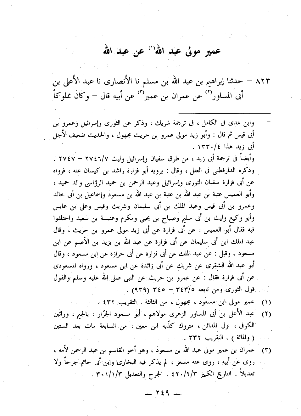 823 - حَدَّثَنَا إِبْرَاهِيمُ بْنُ عَبْدِ اللَّهِ بْنِ مُسْلِمٍ، نا الْأَنْصَارِيُّ، نا عَبْدُ الْأَعْلَى بْنُ أَبِي الْمُسَاوِرِ، عَنْ عِمْرَانَ بْنِ عُمَيْرٍ، عَنْ أَبِيهِ، قَالَ: وَكَانَ مَمْلُوكًا -[250]- لِعَبْدِ اللَّهِ بْنِ مَسْعُودٍ , فَقَالَ لَهُ: يَا عُمَيْرُ، بَيِّنْ لِي مَا مَالَكَ؟ فَإِنِّي أُرِيدُ أُعْتِقَكَ، وَإِنِّي سَمِعْتُ رَسُولَ اللَّهِ صَلَّى اللهُ عَلَيْهِ وَسَلَّمَ يَقُولُ: «§مَنْ أَعْتَقَ عَبْدًا فَمَالُهُ لِلَّذِي أَعْتَقَ»