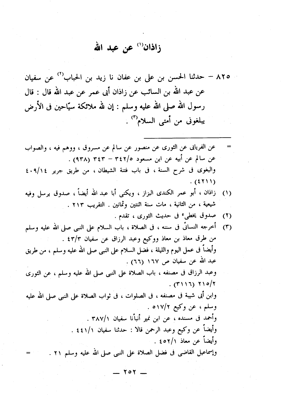 825 - حَدَّثَنَا الْحَسَنُ بْنُ عَلِيِّ بْنِ عَفَّانَ، نا زَيْدُ بْنُ الْحُبَابِ، عَنْ سُفْيَانَ، عَنْ عَبْدِ اللَّهِ بْنِ السَّائِبِ، عَنْ زَاذَانَ أَبِي عُمَرَ، عَنْ عَبْدِ اللَّهِ قَالَ: قَالَ رَسُولُ اللَّهِ صَلَّى اللهُ عَلَيْهِ وَسَلَّمَ: «إِنَّ §لِلَّهِ مَلَائِكَةً سَيَّاحِينَ فِي الْأَرْضِ، يُبَلِّغُونِي مِنْ أُمَّتِي السَّلَامَ»