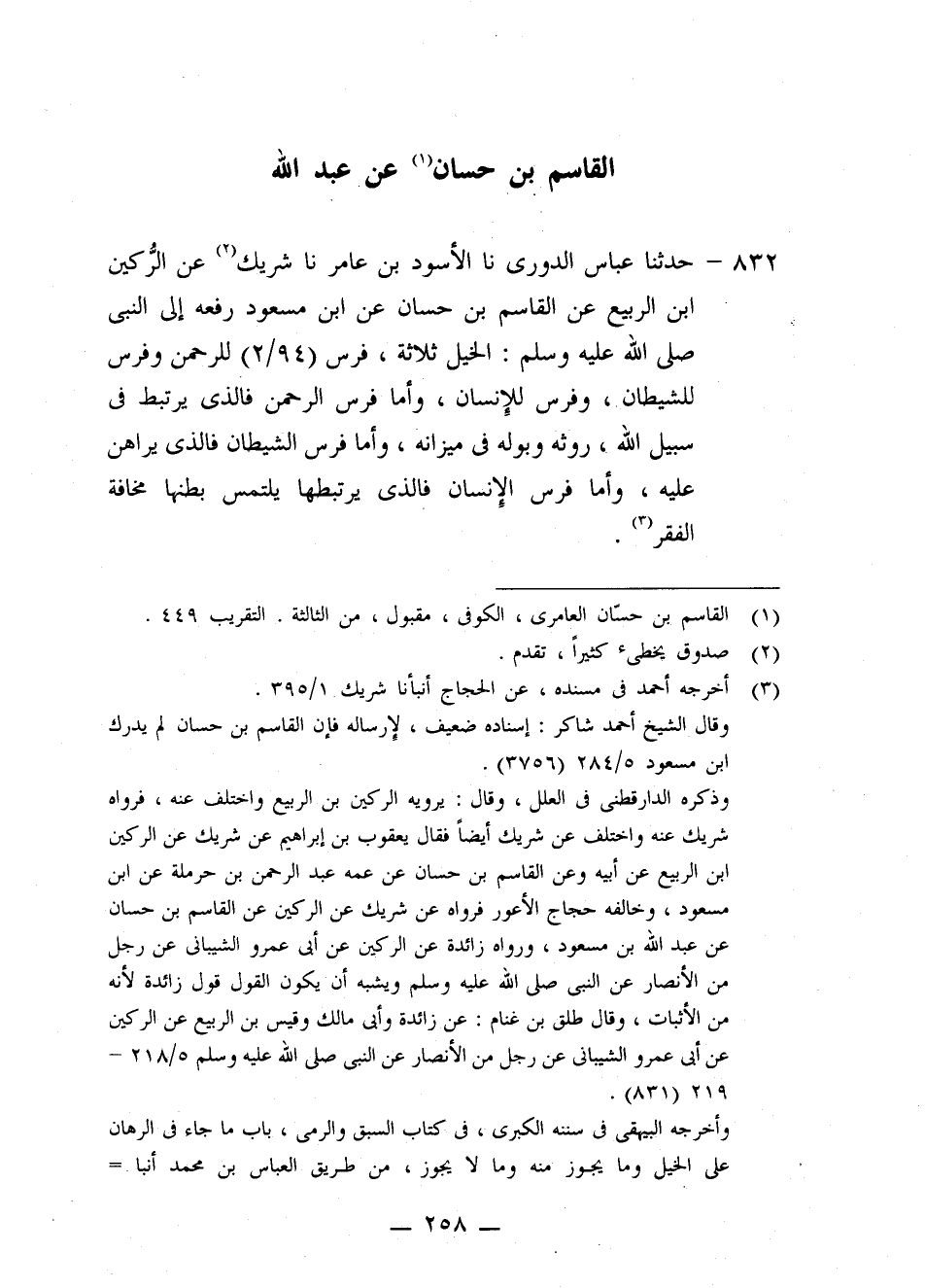 832 - حَدَّثَنَا عَبَّاسٌ الدُّورِيُّ، نا الْأَسْوَدُ بْنُ عَامِرٍ، نا شَرِيكٌ، عَنِ الرُّكَيْنِ بْنِ الرَّبِيعِ، عَنِ الْقَاسِمِ بْنِ حَسَّانَ، عَنِ ابْنِ مَسْعُودٍ، رَفَعَهُ إِلَى النَّبِيِّ صَلَّى اللهُ عَلَيْهِ وَسَلَّمَ: " §الْخَيْلُ ثَلَاثَةٌ: فَرَسٌ لِلرَّحْمَنِ، وَفَرَسٌ لِلشَّيْطَانِ، وَفَرَسٌ لِلْإِنْسَانِ، وَأَمَّا فَرَسُ الرَّحْمَنِ فَالَّذِي يُرْتَبَطُ فِي سَبِيلِ اللَّهِ، رَوَثُهُ وَبَوْلُهُ فِي مِيزَانِهِ، وَأَمَّا فَرَسُ الشَّيْطَانِ فَالَّذِي يُرَاهَنُ عَلَيْهِ، وَأَمَّا فَرَسُ الْإِنْسَانِ فَالَّذِي يَرْتَبِطُهَا يَلْتَمِسُ بَطْنَهَا مَخَافَةَ الْفَقْرِ "