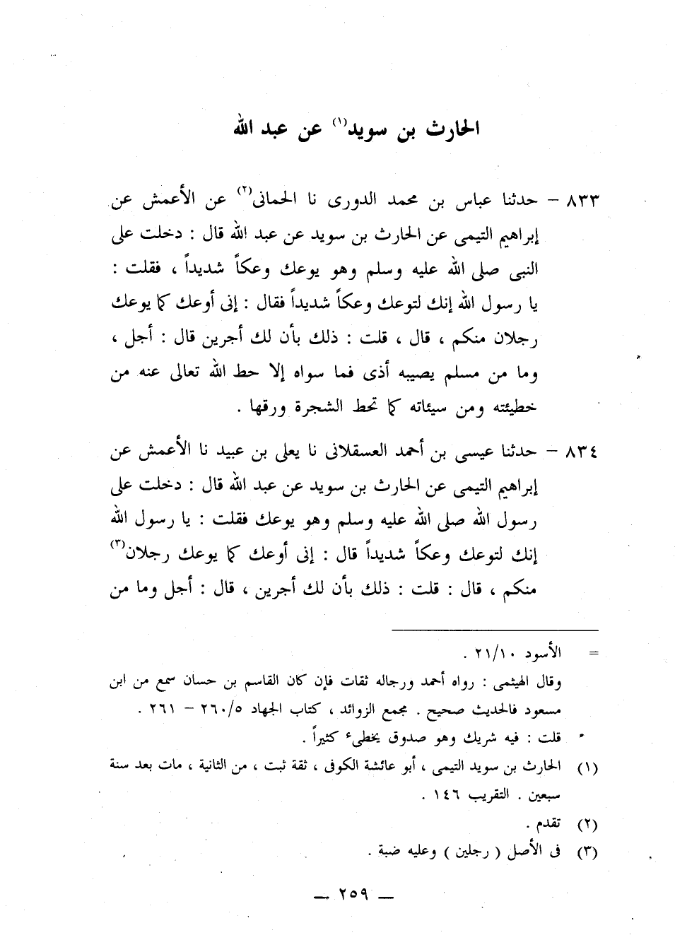 833 - حَدَّثَنَا عَبَّاسُ بْنُ مُحَمَّدٍ الدُّورِيُّ، نا الْحِمَّانِيُّ، عَنِ الْأَعْمَشِ، عَنْ إِبْرَاهِيمَ التَّيْمِيِّ، عَنِ الْحَارِثِ بْنِ سُوَيْدٍ، عَنْ عَبْدِ اللَّهِ قَالَ: دَخَلْتُ عَلَى النَّبِيِّ صَلَّى اللهُ عَلَيْهِ وَسَلَّمَ وَهُوَ يُوعَكُ وَعْكًا شَدِيدًا، فَقُلْتُ: يَا رَسُولَ اللَّهِ، إِنَّكَ لَتُوعَكُ وَعْكًا شَدِيدًا، فَقَالَ: «إِنِّي أُوعَكُ كَمَا يُوعَكُ رَجُلَانِ مِنْكُمْ» قَالَ: قُلْتُ: ذَلِكَ بِأَنَّ لَكَ أَجْرَيْنِ؟ قَالَ: «أَجَلْ، §وَمَا مِنْ مُسْلِمٍ يُصِيبُهُ أَذًى فَمَا سِوَاهُ إِلَّا حَطَّ اللَّهُ تَعَالَى عَنْهُ مِنْ خَطِيئَتِهِ وَمِنْ سَيِّئَاتِهِ كَمَا تَحُطُّ الشَّجَرَةُ وَرَقَهَا»