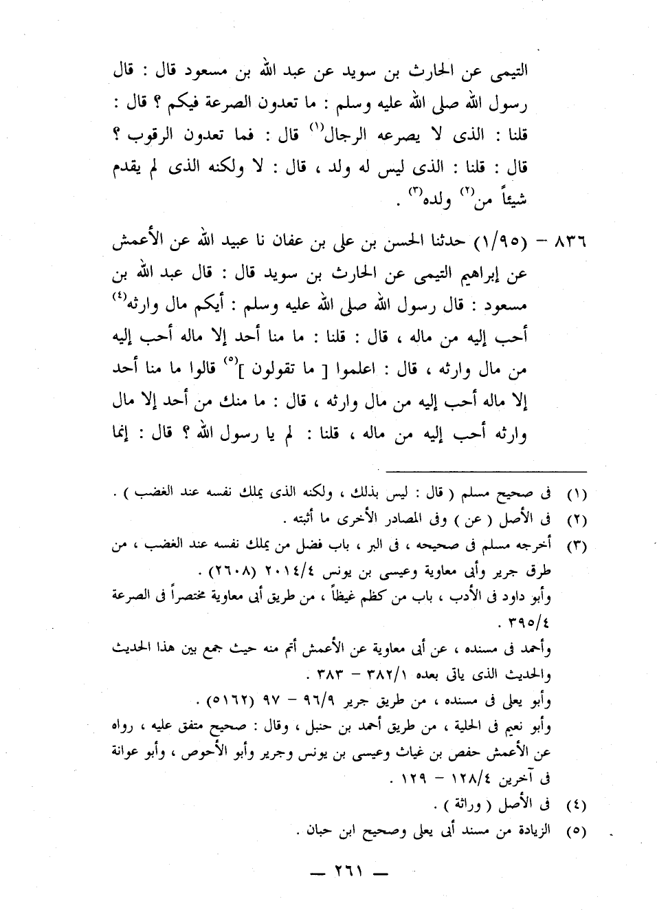 836 - حَدَّثَنَا الْحَسَنُ بْنُ عَلِيِّ بْنِ عَفَّانَ، نا عُبَيْدُ اللَّهِ، عَنِ الْأَعْمَشِ، عَنْ إِبْرَاهِيمَ التَّيْمِيِّ، عَنِ الْحَارِثِ بْنِ سُوَيْدٍ قَالَ: قَالَ عَبْدُ اللَّهِ بْنِ مَسْعُودٍ قَالَ: رَسُولُ اللَّهِ صَلَّى اللهُ عَلَيْهِ وَسَلَّمَ: «§أَيُّكُمْ مَالُ وَارِثِهِ أَحَبُّ إِلَيْهِ مِنْ مَالِهِ؟» قَالَ: قُلْنَا: مَا مِنَّا أَحَدٌ إِلَّا مَالُهُ أَحَبُّ إِلَيْهِ مِنْ مَالِ وَارِثِهِ قَالَ: «اعْلَمُوا مَا تَقُولُونَ» ، قَالُوا: مَا مِنَّا أَحَدٌ إِلَّا مَالُهُ أَحَبُّ إِلَيْهِ مِنْ مَالِ وَارِثِهِ قَالَ: «مَا مِنْكُمْ مِنْ أَحَدٍ إِلَّا مَالُ وَارِثِهِ أَحَبُّ إِلَيْهِ مِنْ مَالِهِ؟» قُلْنَا: لِمَ يَا رَسُولَ اللَّهِ؟ قَالَ: «إِنَّمَا لِأَحَدِكُمْ مِنْ مَالِهِ مَا قَدَّمَ»