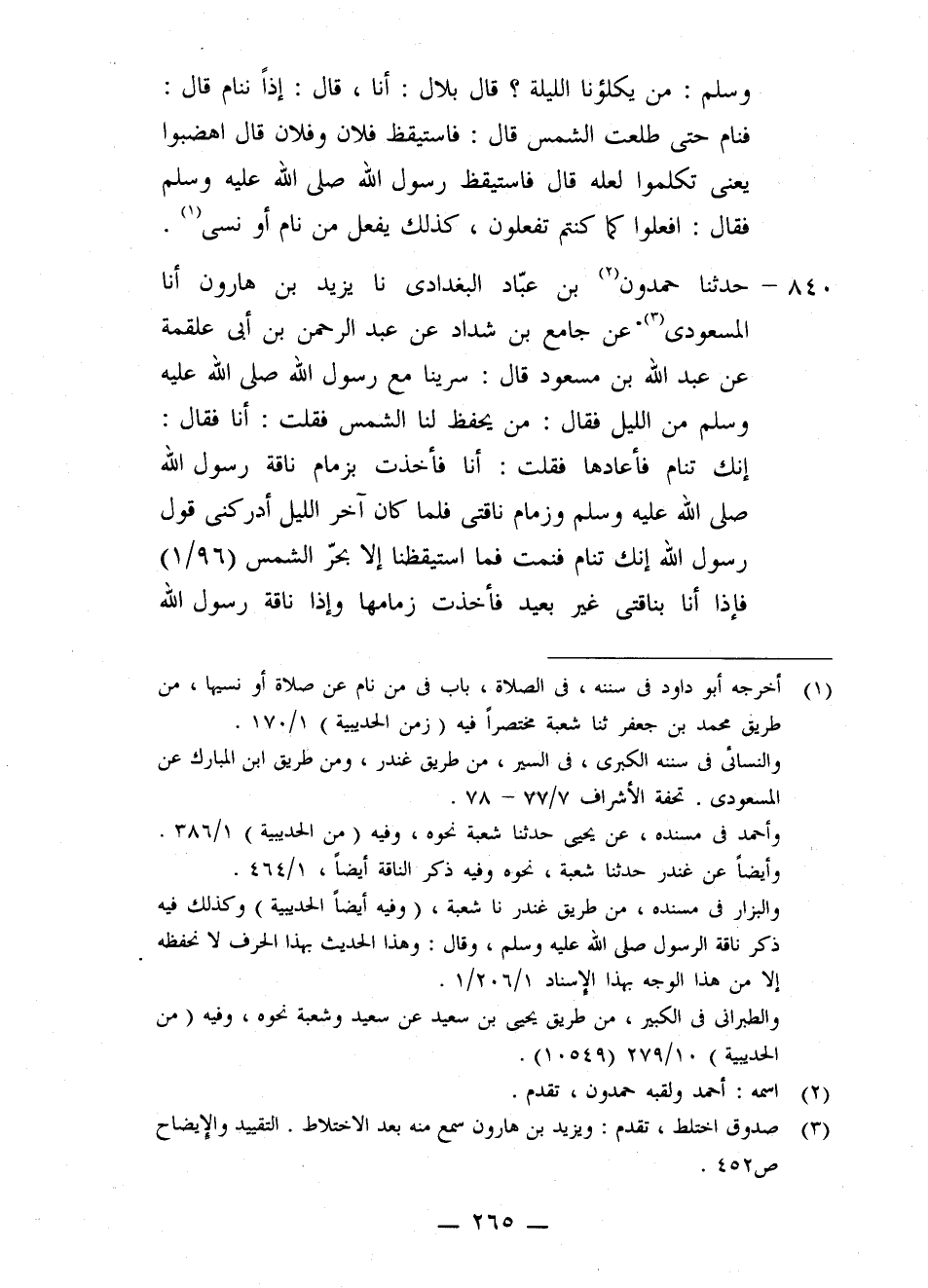 840 - حَدَّثَنَا حَمْدُونُ بْنُ عَبَّادٍ الْبَغْدَادِيُّ، نا يَزِيدُ بْنُ هَارُونَ، أنا الْمَسْعُودِيُّ، عَنْ جَامِعِ بْنِ شَدَّادٍ، عَنْ عَبْدِ الرَّحْمَنِ بْنِ أَبِي عَلْقَمَةَ، عَنْ عَبْدِ اللَّهِ بْنِ مَسْعُودٍ قَالَ: سَرَيْنَا مَعَ رَسُولِ اللَّهِ صَلَّى اللهُ عَلَيْهِ وَسَلَّمَ مِنَ اللَّيْلِ، فَقَالَ: «مَنْ يَحْفَظُ لَنَا الشَّمْسَ» ، فَقُلْتُ: أَنَا، فَقَالَ: «إِنَّكَ تَنَامُ» ، فَأَعَادَهَا، فَقُلْتُ: أَنَا، فَأَخَذْتُ بِزِمَامِ نَاقَةِ رَسُولِ اللَّهِ صَلَّى اللهُ عَلَيْهِ وَسَلَّمَ وَزِمَامِ نَاقَتِي، فَلَمَّا كَانَ آخِرُ اللَّيْلِ أَدْرَكَنِي قَوْلُ رَسُولِ اللَّهِ: «إِنَّكَ تَنَامُ» ، فَنِمْتُ، فَمَا اسْتَيْقَظْنَا إِلَّا بَحْرِ الشَّمْسِ، فَإِذَا أَنَا بِنَاقَتِي غَيْرُ بَعِيدٍ، فَأَخَذْتُ زِمَامَهَا، وَإِذَا نَاقَةُ رَسُولِ اللَّهِ صَلَّى اللهُ عَلَيْهِ وَسَلَّمَ -[266]- قَدْ غَابَتْ عَنَّا، فَقَالَ رَسُولُ اللَّهِ صَلَّى اللهُ عَلَيْهِ وَسَلَّمَ لِرَجُلٍ: «خُذْ هَاهُنَا» ، وَأَشَارَ إِلَى مَوْضِعٍ فَذَهَبَ فَإِذَا هُوَ بِهَا، وَإِذَا زِمَامُهَا الْتَوَى عَلَى شَجَرَةٍ مَا كَانَتْ لِتَحُلَّهَا إِلَّا يَدٌ، فَجَاءَ بِهَا، فَقَامَ رَسُولُ اللَّهِ صَلَّى اللهُ عَلَيْهِ وَسَلَّمَ فَتَوَضَّأَ وَتَوَضَّأَ الْقَوْمُ، ثُمَّ أَمَرَ بِلَالًا فَأَذَّنَ وَصَلُّوا الرَّكْعَتَيْنِ قَبْلَ الْفَجْرِ، ثُمَّ أَقَامَ فَصَلَّى رَسُولُ اللَّهِ صَلَّى اللهُ عَلَيْهِ وَسَلَّمَ بِالنَّاسِ، فَلَمَّا سَلَّمَ قَالَ: «إِنَّ اللَّهَ §لَوْ شَاءَ أَنْ لَا تَنَامُوا عَنْهَا لَمْ تَنَامُوا، وَلَكِنْ أَرَادَ أَنْ يَكُونَ لِمَنْ بَعْدَكُمْ، فَهَكَذَا لِمَنْ نَامَ أَوْ نَسِيَ»