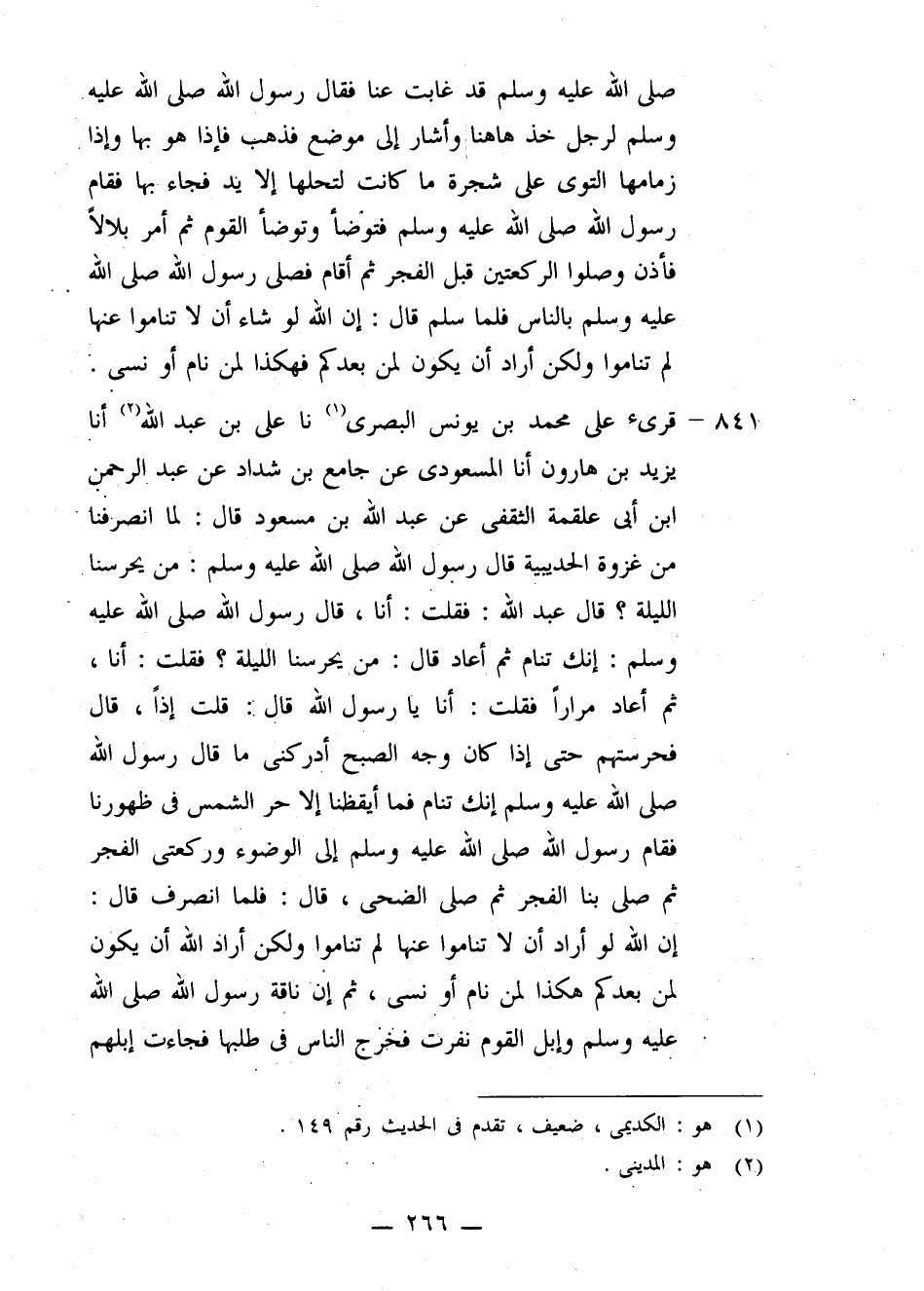 841 - قُرِئَ عَلَى مُحَمَّدِ بْنِ يُونُسَ الْبَصْرِيِّ، نا عَلِيُّ بْنُ عَبْدِ اللَّهِ، أنا يَزِيدُ بْنُ هَارُونَ، أنا الْمَسْعُودِيُّ، عَنْ جَامِعِ بْنِ شَدَّادٍ، عَنْ عَبْدِ الرَّحْمَنِ بْنِ أَبِي عَلْقَمَةَ الثَّقَفِيِّ، عَنْ عَبْدِ اللَّهِ بْنِ مَسْعُودٍ قَالَ: لَمَّا انْصَرَفْنَا مِنْ غَزْوَةِ الْحُدَيْبِيَةِ قَالَ رَسُولُ اللَّهِ صَلَّى اللهُ عَلَيْهِ وَسَلَّمَ: «مَنْ يَحْرُسُنَا اللَّيْلَةَ؟» قَالَ عَبْدُ اللَّهِ: فَقُلْتُ: أَنَا، قَالَ رَسُولُ اللَّهِ صَلَّى اللهُ عَلَيْهِ وَسَلَّمَ: «إِنَّكَ تَنَامُ» ، ثُمَّ أَعَادَ قَالَ: «مَنْ يَحْرُسُنَا اللَّيْلَةَ؟» فَقُلْتُ: أَنَا، ثُمَّ أَعَادَ مِرَارًا، فَقُلْتُ: أَنَا يَا رَسُولَ اللَّهِ قَالَ: قُلْتَ: إِذًا قَالَ: فَحَرَسْتُهُمْ حَتَّى إِذَا كَانَ وَجْهُ الصُّبْحِ أَدْرَكَنِي مَا قَالَ رَسُولُ اللَّهِ صَلَّى اللهُ عَلَيْهِ وَسَلَّمَ: «إِنَّكَ تَنَامُ» ، فَمَا أَيْقَظَنَا إِلَّا حَرُّ الشَّمْسِ فِي ظُهُورِنَا، فَقَامَ رَسُولُ اللَّهِ صَلَّى اللهُ عَلَيْهِ وَسَلَّمَ إِلَى الْوُضُوءِ وَرَكْعَتَيِ الْفَجْرِ، ثُمَّ صَلَّى بِنَا الْفَجْرَ، ثُمَّ صَلَّى الضُّحَى قَالَ فَلَمَّا انْصَرَفَ قَالَ: «إِنَّ §اللَّهَ لَوْ أَرَادَ أَنْ لَا تَنَامُوا عَنْهَا لَمْ تَنَامُوا، وَلَكِنْ أَرَادَ اللَّهُ أَنْ يَكُونَ لِمَنْ بَعْدَكُمْ هَكَذَا لِمَنْ نَامَ أَوْ نَسِيَ» ، ثُمَّ إِنَّ نَاقَةَ رَسُولِ اللَّهِ صَلَّى اللهُ عَلَيْهِ وَسَلَّمَ وَإِبِلُ الْقَوْمِ نَفَرَتْ، فَخَرَجَ النَّاسُ فِي طَلَبِهَا، فَجَاءَتْ إِبِلُهُمْ -[267]- إِلَّا نَاقَةَ رَسُولِ اللَّهِ صَلَّى اللهُ عَلَيْهِ وَسَلَّمَ، فَقَالَ عَبْدُ اللَّهِ: قَالَ لِي رَسُولُ اللَّهِ صَلَّى اللهُ عَلَيْهِ وَسَلَّمَ: «خُذْ هَاهُنَا» ، فَأَخَذْتُ حَيْثُ قَالَ لِي، فَوَجَدْتُ زِمَامَهَا قَدِ الْتَوَى عَلَى شَجَرَةٍ، مَا كَانَتْ تَحُلُّهَا إِلَّا يَدٌ قَالَ: فَجِئْتُ بِهَا إِلَى رَسُولِ اللَّهِ صَلَّى اللهُ عَلَيْهِ وَسَلَّمَ، فَقُلْتُ: يَا رَسُولَ اللَّهِ وَالَّذِي بَعَثَكَ بِالْحَقِّ لَقَدْ وَجَدْتُ زِمَامَهَا مُلْتَوِيًا عَلَى شَجَرَةٍ مَا كَانَتْ تَحُلُّهَا إِلَّا يَدٌ "