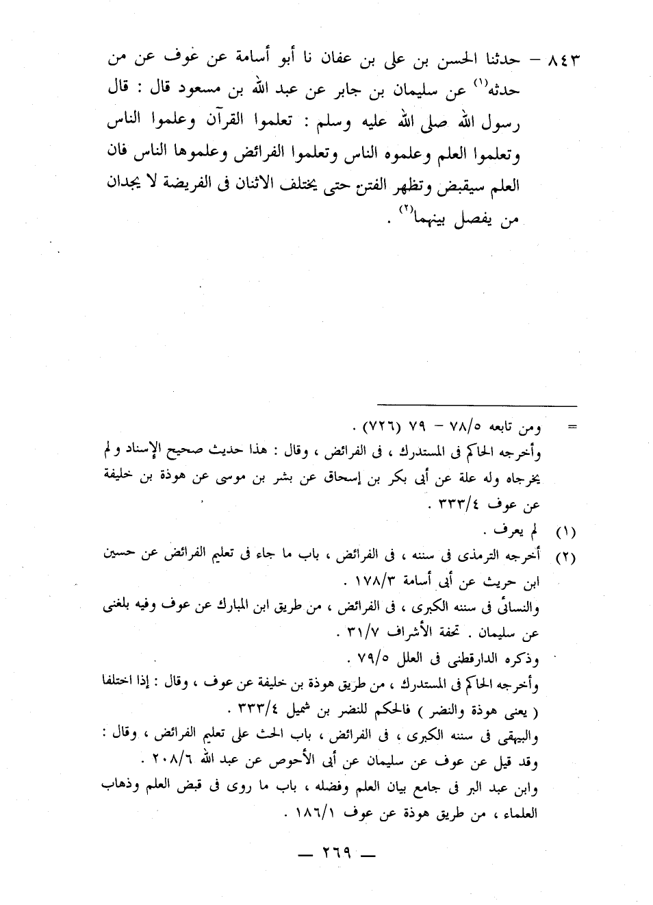 843 - حَدَّثَنَا الْحَسَنُ بْنُ عَلِيِّ بْنِ عَفَّانَ، نا أَبُو أُسَامَةَ، عَنْ عَوْفٍ، عَنْ مَنْ حَدَّثَهُ، عَنْ سُلَيْمَانَ بْنِ جَابِرٍ، عَنْ عَبْدِ اللَّهِ بْنِ مَسْعُودٍ قَالَ: قَالَ رَسُولُ اللَّهِ صَلَّى اللهُ عَلَيْهِ وَسَلَّمَ: «§تَعَلَّمُوا الْقُرْآنَ وَعَلِمُوا النَّاسَ، وَتَعَلَّمُوا الْعِلْمَ وَعَلِّمُوهُ النَّاسَ، وَتَعَلَّمُوا الْفَرَائِضَ وَعَلِّمُوهَا النَّاسَ؛ فَإِنَّ الْعِلْمَ سَيُقْبَضُ وَتَظْهَرُ الْفِتَنُ حَتَّى يَخْتَلِفَ الِاثْنَانِ فِي الْفَرِيضَةِ لَا يَجِدَانِ مَنْ يَفْصِلُ بَيْنَهُمَا»