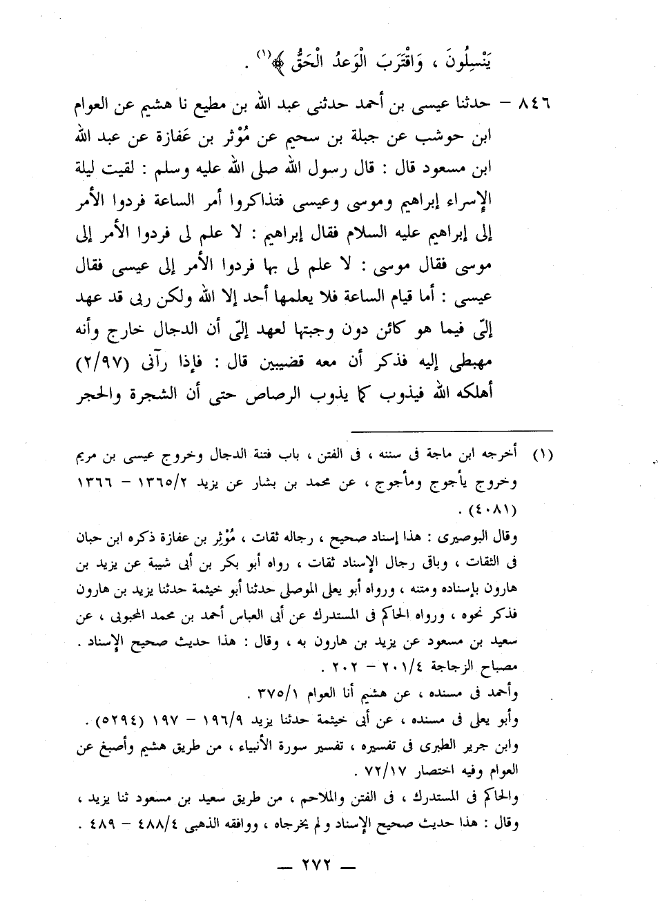 846 - حَدَّثَنَا عِيسَى بْنُ أَحْمَدَ، حَدَّثَنِي عَبْدُ اللَّهِ بْنُ مُطِيعٍ، نا هُشَيْمٌ، عَنِ الْعَوَّامِ بْنِ حَوْشَبٍ، عَنْ جَبَلَةَ بْنِ سُحَيْمٍ، عَنْ مُوثِرِ بْنِ عَفَازَةَ، عَنْ عَبْدِ اللَّهِ بْنِ مَسْعُودٍ قَالَ: قَالَ رَسُولُ اللَّهِ صَلَّى اللهُ عَلَيْهِ وَسَلَّمَ: " §لَقِيتُ لَيْلَةَ الْإِسْرَاءِ إِبْرَاهِيمَ وَمُوسَى وَعِيسَى، فَتَذَاكَرُوا أَمَرَ السَّاعَةِ، فَرَدُّوا الْأَمْرَ إِلَى إِبْرَاهِيمَ عَلَيْهِ السَّلَامُ، فَقَالَ إِبْرَاهِيمُ: لَا عِلْمَ لِي، فَرَدُّوا الْأَمْرَ إِلَى مُوسَى، فَقَالَ مُوسَى: لَا عِلْمَ لِي بِهَا، فَرَدُّوا الْأَمْرَ إِلَى عِيسَى، فَقَالَ عِيسَى: أَمَّا قِيَامُ السَّاعَةِ فَلَا يَعْلَمُهَا أَحَدٌ إِلَّا اللَّهَ، وَلَكِنَّ رَبِّي قَدْ عَهِدَ إِلَيَّ فِيمَا هُوَ كَائِنٌ دُونَ وَجْبَتِهَا لِعَهْدٍ إِلَيَّ، أَنَّ الدَّجَّالَ خَارِجٌ، وَأَنَّهُ مُهْبِطِي إِلَيْهِ - فَذَكَرَ أَنَّ مَعَهُ قَضِيبَيْنِ - قَالَ: فَإِذَا رَآنِي أَهْلَكَهُ اللَّهُ فَيَذُوبُ كَمَا يَذُوبُ الرَّصَاصُ، حَتَّى أَنَّ الشَّجَرَةَ وَالْحَجَرَ -[273]- لَيَقُولُ: يَا مُسْلِمُ، هَذَا كَافِرٌ فَتَعَالَ فَاقْتُلْهُ قَالَ: فَيُهْلِكَهُمْ فَيَرْجِعُ النَّاسُ إِلَى بِلَادِهِمْ وَأَوْطَانِهِمْ فَيَسْتَقْبِلُهُمْ يَأْجُوجُ وَمَأْجُوجُ وَهُمْ مِنْ كُلِّ حَدَبٍ يَنْسِلُونَ، لَا يَأْتُونَ عَلَى شَيْءٍ إِلَّا أَهْلَكُوهُ، وَلَا يَمُرُّونَ عَلَى مَاءٍ إِلَّا شَرِبُوهُ، وَيَرْجِعُ النَّاسُ إِلَيَّ فَيَشْكُونَهُمْ فَأَدْعُو اللَّهَ عَلَيْهِمْ فَيُهْلِكُهُمْ وَيُمِيتُهُمْ حَتَّى تَجْوَى الْأَرْضُ مِنْ نَتَنِ رِيحِهِمْ، فَيَنْزِلُ الْمَطَرُ فَتُجَرَّفُ أَجْسَادُهُمْ فَتُلْقِيهِمْ فِي الْبَحْرِ، ثُمَّ تُنْسَفُ الْجِبَالُ حَتَّى تَكُونَ الْأَرْضُ كَالْأَدِيمِ، فَعَهِدَ إِلَيَّ رَبِّي أَنَّ ذَلِكَ إِذَا كَانَ كَذَلِكَ فَإِنَّ السَّاعَةَ مِنْهُمْ كَالْحَامِلِ الْمُتِمِّ الَّذِي لَا يَدْرِي أَهْلُهَا مَتَى يَفْجَؤُهُمْ بِوِلَادِهَا لَيْلًا أَوْ نَهَارًا "