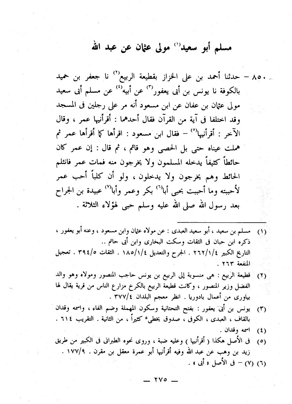 850 - حَدَّثَنَا أَحْمَدُ بْنُ عَلِيٍّ الْخَزَّازُ، بِقَطِيعَةِ الرَّبِيعِ، نا جَعْفَرُ بْنُ حُمَيْدٍ، بِالْكُوفَةِ، نا يُونُسُ بْنُ أَبِي يَعْفُورٍ، عَنْ أَبِيهِ، عَنْ مُسْلِمٍ أَبِي سَعِيدٍ مَوْلَى عُثْمَانَ بْنِ عَفَّانَ، عَنِ ابْنِ مَسْعُودٍ، أَنَّهُ مَرَّ عَلَى رَجُلَيْنِ فِي الْمَسْجِدِ وَقَدِ اخْتَلَفَا فِي آيَةٍ مِنَ الْقُرْآنِ، فَقَالَ أَحَدُهُمَا: أَقْرَأَنِيهَا عُمَرُ، وَقَالَ الْآخَرُ: أَقْرَأَنِيهَا. .، فَقَالَ ابْنُ مَسْعُودٍ: «اقْرَأْهَا كَمَا أَقْرَأَهَا عُمَرُ» ، ثُمَّ هَمَلَتْ عَيْنَاهُ حَتَّى بَلَّ الْحَصَى وَهُوَ قَائِمٌ، ثُمَّ قَالَ: «§إِنَّ عُمَرَ كَانَ حَائِطًا كَثِيفًا يَدْخُلُهُ الْمُسْلِمُونَ وَلَا يَخْرُجُونَ مِنْهُ، فَمَاتَ عُمَرُ فَانْثَلَمَ الْحَائِطُ، وَهُمْ يَخْرُجُونَ وَلَا يَدْخُلُونَ، وَلَوْ أَنَّ كَلْبًا أَحَبَّ عُمَرَ لَأَحْبَبْتُهُ وَمَا أَحْبَبْتُ بِحُبِّي أَبَا بَكْرٍ وَعُمَرَ وَأَبَا عُبَيْدَةَ بْنَ الْجَرَّاحِ بَعْدَ رَسُولِ اللَّهِ صَلَّى اللهُ عَلَيْهِ وَسَلَّمَ حُبِّي لِهَؤُلَاءِ الثَّلَاثَةِ»