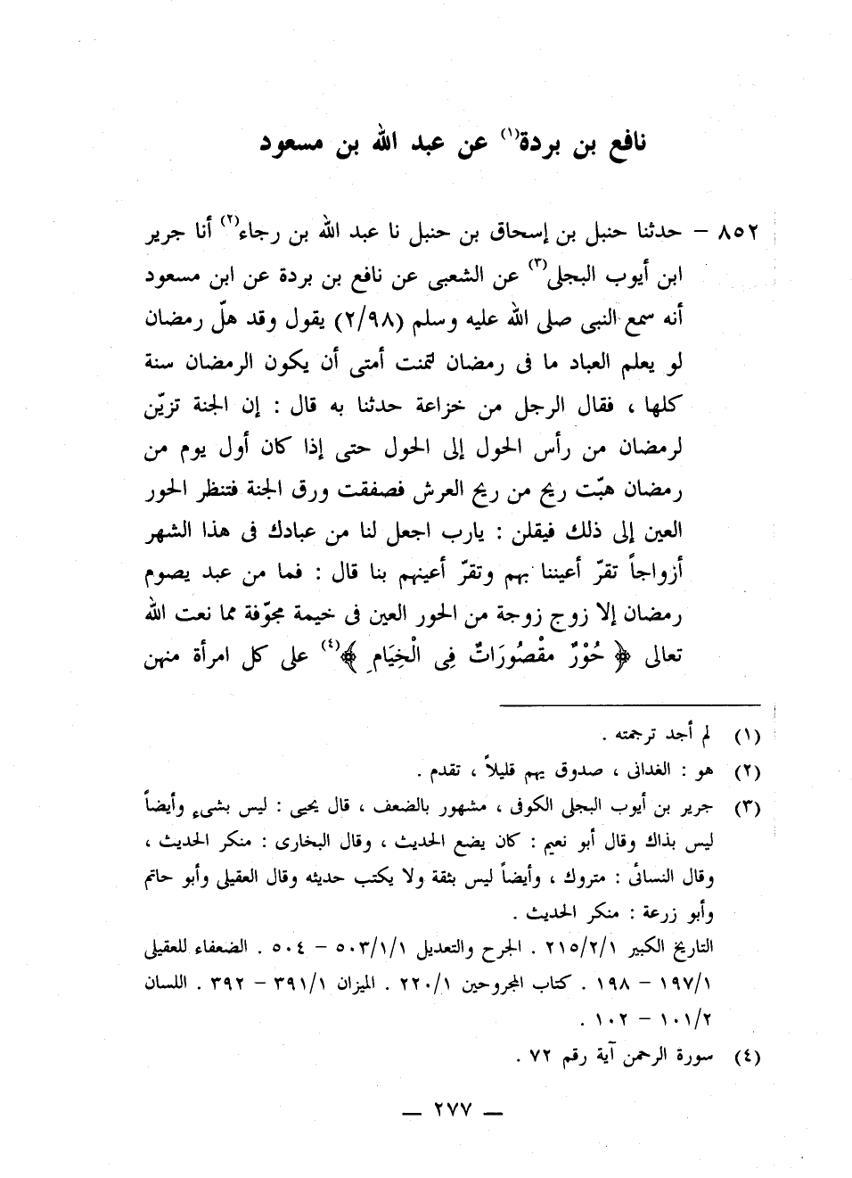 852 - حَدَّثَنَا حَنْبَلُ بْنُ إِسْحَاقَ بْنِ حَنْبَلٍ، نا عَبْدُ اللَّهِ بْنُ رَجَاءٍ، أنا جَرِيرُ بْنُ أَيُّوبَ الْبَجَلِيُّ، عَنِ الشَّعْبِيِّ، عَنْ نَافِعِ بْنِ بُرْدَةَ، عَنِ ابْنِ مَسْعُودٍ، أَنَّهُ سَمِعَ النَّبِيَّ صَلَّى اللهُ عَلَيْهِ وَسَلَّمَ يَقُولُ وَقَدْ هَلَّ رَمَضَانُ: «§لَوْ يَعْلَمُ الْعِبَادُ مَا فِي رَمَضَانَ لَتَمَنَّتْ أُمَّتِي أَنْ يَكُونَ رَمَضَانُ سَنَةً كُلَّهَا» ، فَقَالَ الرَّجُلُ مِنْ خُزَاعَةَ: حَدِّثْنَا بِهِ قَالَ: " إِنَّ الْجَنَّةَ تُزَيَّنُ لِرَمَضَانَ مِنْ رَأْسِ الْحَوْلِ إِلَى الْحَوْلِ، حَتَّى إِذَا كَانَ أَوَّلُ يَوْمٍ مِنْ رَمَضَانَ هَبَّتْ رِيحٌ مِنْ رِيحِ الْعَرْشِ فَصَفَّقَتْ وَرَقَ الْجَنَّةِ فَتَنْظُرُ الْحُورُ الْعَيْنُ إِلَى ذَلِكَ فَيَقُلْنَ: يَا رَبِّ، اجْعَلْ لَنَا مِنْ عِبَادِكَ فِي هَذَا الشَّهْرِ أَزْوَاجًا تُقَرُّ أَعْيُنُنَا بِهِمْ وَتُقَرُّ أَعْيُنُهُمْ بِنَا قَالَ: فَمَا مِنْ عَبْدٍ يَصُومُ رَمَضَانَ إِلَّا زُوِّجَ زَوْجَةٌ مِنَ الْحُورِ الْعَيْنِ فِي خَيْمَةٍ مُجَوَّفَةٍ مِمَّا نَعَتَ اللَّهُ تَعَالَى {حُورٌ مَقْصُورَاتٌ فِي الْخِيَامِ} [الرحمن: 72] ، عَلَى كُلِّ امْرَأَةٍ مِنْهُنَّ -[278]- سَبْعُونَ حُلَّةً، لَيْسَ مِنْهَا حُلَّةٌ عَلَى لَوْنِ الْأُخْرَى، وَتُعْطَى سَبْعِينَ لَوْنًا مِنَ الطِّيبِ، لَيْسَ مِنْهَا لَوْنٌ عَلَى رِيحِ الْآخَرِ، لِكُلِّ امْرَأَةٍ مِنْهُنَّ سَبْعُونَ سَرِيرًا مِنْ يَاقُوتَةٍ حَمْرَاءَ مُوَشَّحَةٍ بِالدُّرِ، عَلَى كُلِّ سَرِيرٍ سَبْعُونَ فِرَاشًا، بَطَائِنُهَا مِنْ إِسْتَبْرَقٍ، وَفَوْقَ السَّبْعِينَ فِرَاشًا سَبْعُونَ أَرِيكًا لِكُلِّ امْرَأَةٍ مِنْهُنَّ سَبْعُونَ أَلْفِ وَصِيفَةٍ لِحَاجَاتِهَا، وَسَبْعُونَ أَلْفِ وَصِيفٍ، مَعَ كُلِّ وَصِيفٍ صَحْفَةٌ مِنْ ذَهَبٍ فِيهَا لَوْنُ طَعَامٍ يَجِدُ لِآخِرِ لُقْمَةٍ مِنْهَا لَذَّةً لَا يَجِدُ لِأَوَّلِهِ، وَيُعْطَى زَوْجُهَا مِثْلَ ذَلِكَ عَلَى سَرِيرٍ مِنْ يَاقُوتٍ أَحْمَرَ، عَلَيْهِ سِوَارَانِ مِنْ ذَهَبٍ مُوَشًا بِيَاقُوتٍ أَحْمَرَ، هَذَا بِكُلِّ يَوْمٍ صَامَهُ مِنْ رَمَضَانَ سِوَى مَا عَمِلَ مِنَ الْحَسَنَاتِ "