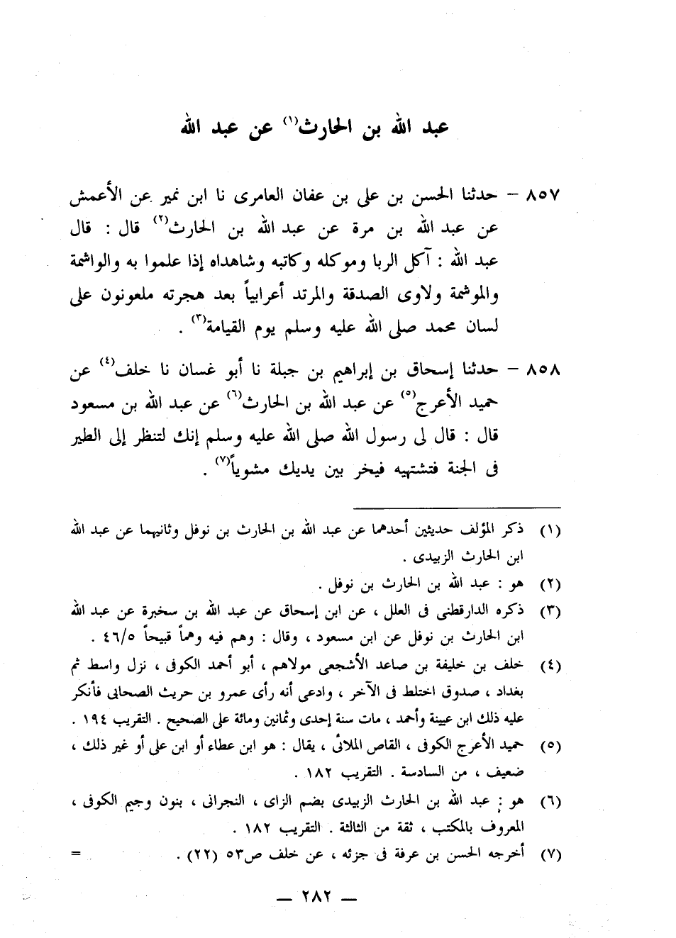 857 - حَدَّثَنَا الْحَسَنُ بْنُ عَلِيِّ بْنِ عَفَّانَ الْعَامِرِيُّ، نا ابْنُ نُمَيْرٍ، عَنِ الْأَعْمَشِ، عَنْ عَبْدِ اللَّهِ بْنِ مُرَّةَ، عَنْ عَبْدِ اللَّهِ بْنِ الْحَارِثِ قَالَ: قَالَ عَبْدُ اللَّهِ: «§آكُلُ الرِّبَا وَمُوكِلُهُ وَكَاتِبُهُ وَشَاهِدَاهُ - إِذَا عَلِمُوا بِهِ - وَالْوَاشِمَةُ وَالْمُوشَمَةُ وَلَاوِي الصَّدَقَةِ وَالْمُرْتَدُّ أَعْرَابِيًّا بَعْدَ هِجْرَتِهِ مَلْعُونُونَ عَلَى لِسَانِ مُحَمَّدٍ صَلَّى اللهُ عَلَيْهِ وَسَلَّمَ يَوْمَ الْقِيَامَةِ»