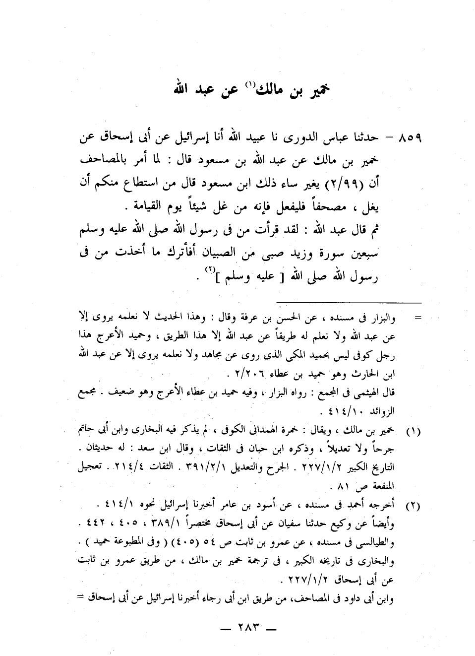 859 - حَدَّثَنَا عَبَّاسٌ الدُّورِيُّ، نا عُبَيْدُ اللَّهِ، أنا إِسْرَائِيلُ، عَنْ أَبِي إِسْحَاقَ، عَنْ خُمَيْرِ بْنِ مَالِكٍ، عَنْ عَبْدِ اللَّهِ بْنِ مَسْعُودٍ قَالَ: لَمَّا أُمِرَ بِالْمَصَاحِفِ أَنْ تُغَيَّرَ سَاءَ ذَلِكَ ابْنَ مَسْعُودٍ قَالَ: «مِنِ اسْتَطَاعَ مِنْكُمْ أَنْ يَغُلَّ مُصْحَفًا فَلْيَفْعَلْ؛ فَإِنَّهُ مَنْ غَلَّ شَيْئًا جَاءَ بِمَا غَلَّ يَوْمَ الْقِيَامَةِ» , ثُمَّ قَالَ عَبْدُ اللَّهِ: «لَقَدْ §قَرَأْتُ مِنْ فِي رَسُولِ اللَّهِ صَلَّى اللهُ عَلَيْهِ وَسَلَّمَ سَبْعِينَ سُورَةً، وَزَيْدٌ صَبِيٌّ مِنَ الصِّبْيَانِ، أَفَأَتْرُكُ مَا أَخَذْتُ مِنْ فِي رَسُولِ اللَّهِ صَلَّى اللهُ عَلَيْهِ وَسَلَّمَ»