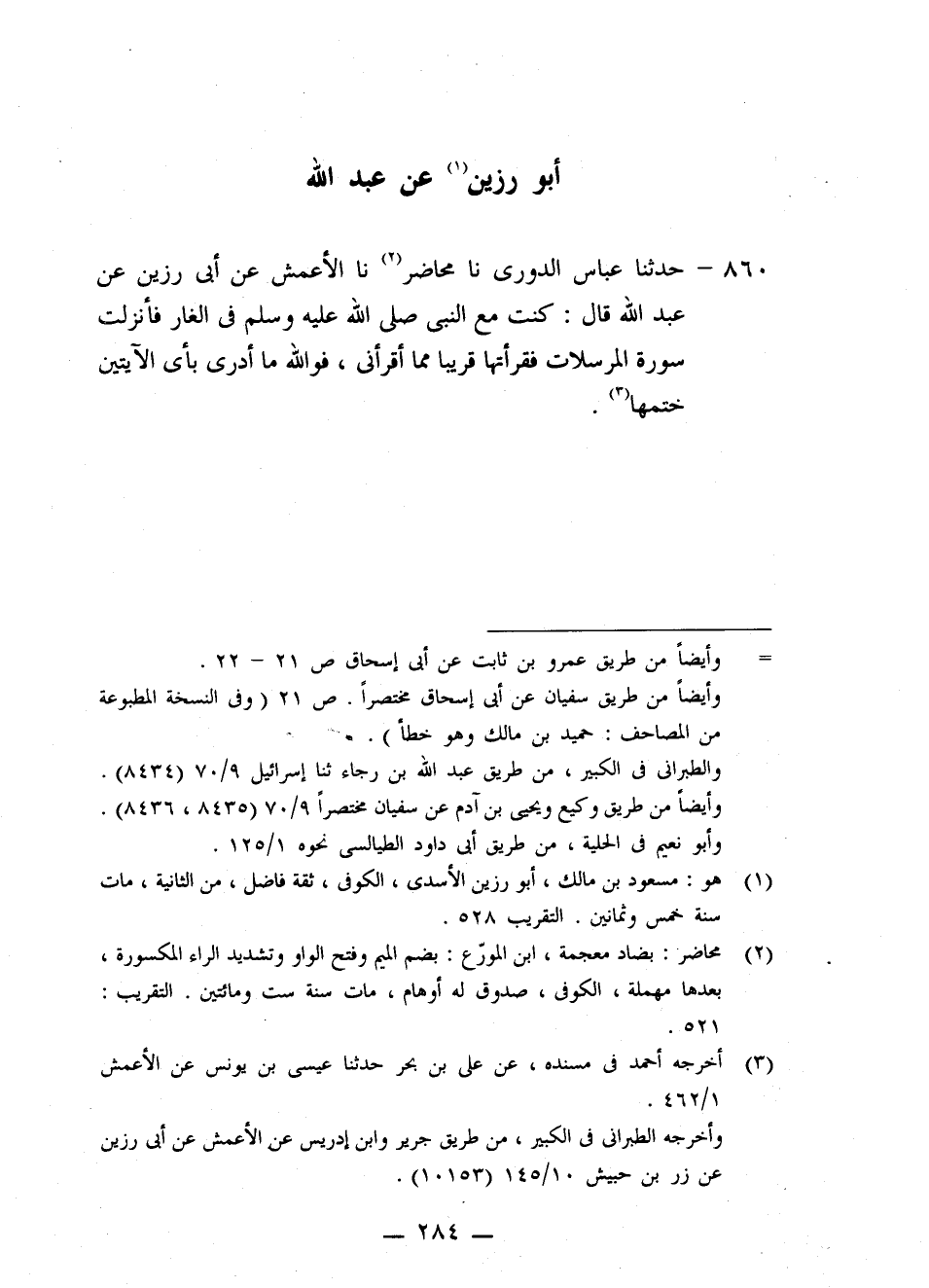 860 - حَدَّثَنَا عَبَّاسٌ الدُّورِيُّ، نا مُحَاضِرٌ، نا الْأَعْمَشُ، عَنْ أَبِي رَزِينٍ، عَنْ عَبْدِ اللَّهِ قَالَ: «§كُنْتُ مَعَ النَّبِيِّ صَلَّى اللهُ عَلَيْهِ وَسَلَّمَ فِي الْغَارِ، فَأُنْزِلَتْ سُورَةُ الْمُرْسَلَاتِ، فَقَرَأْتُهَا قَرِيبًا مِمَّا أَقْرَأَنِي، فَوَاللَّهِ مَا أَدْرِي بِأَيِّ الْآيَتَيْنِ خَتَمَهَا»
