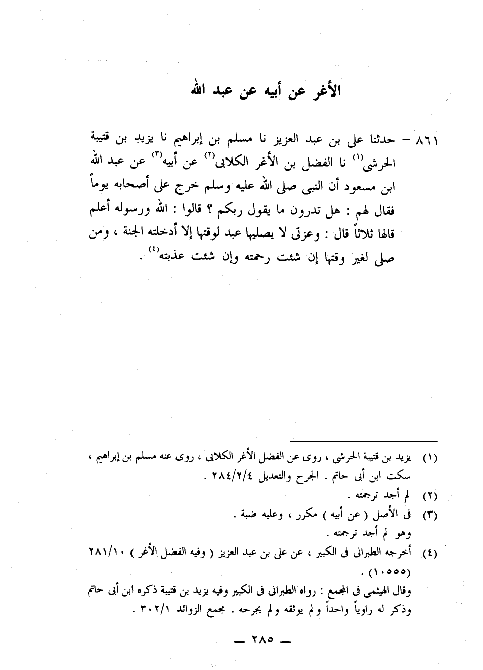 861 - حَدَّثَنَا عَلِيُّ بْنُ عَبْدِ الْعَزِيزِ، نا مُسْلِمُ بْنُ إِبْرَاهِيمَ، نا يَزِيدُ بْنُ قُتَيْبَةَ الْحَرَشِيُّ، نا الْفَضْلُ بْنُ الْأَغَرِّ الْكِلَابِيُّ، عَنْ أَبِيهِ، عَنْ عَبْدِ اللَّهِ بْنِ مَسْعُودٍ، أَنَّ النَّبِيَّ صَلَّى اللهُ عَلَيْهِ وَسَلَّمَ خَرَجَ عَلَى أَصْحَابِهِ يَوْمًا فَقَالَ لَهُمْ: §هَلْ تَدْرُونَ مَا يَقُولُ رَبُّكُمْ؟ قَالُوا: اللَّهُ وَرَسُولُهُ أَعْلَمُ قَالَهَا ثَلَاثًا قَالَ: «وَعِزَّتِي لَا يُصَلِّيهَا عَبْدٌ لِوَقْتِهَا إِلَّا أَدْخَلْتُهُ الْجَنَّةَ، وَمَنْ صَلَّى لِغَيْرِ وَقْتِهَا إِنْ شِئْتُ رَحِمْتُهُ وَإِنْ شِئْتُ عَذَّبْتُهُ»