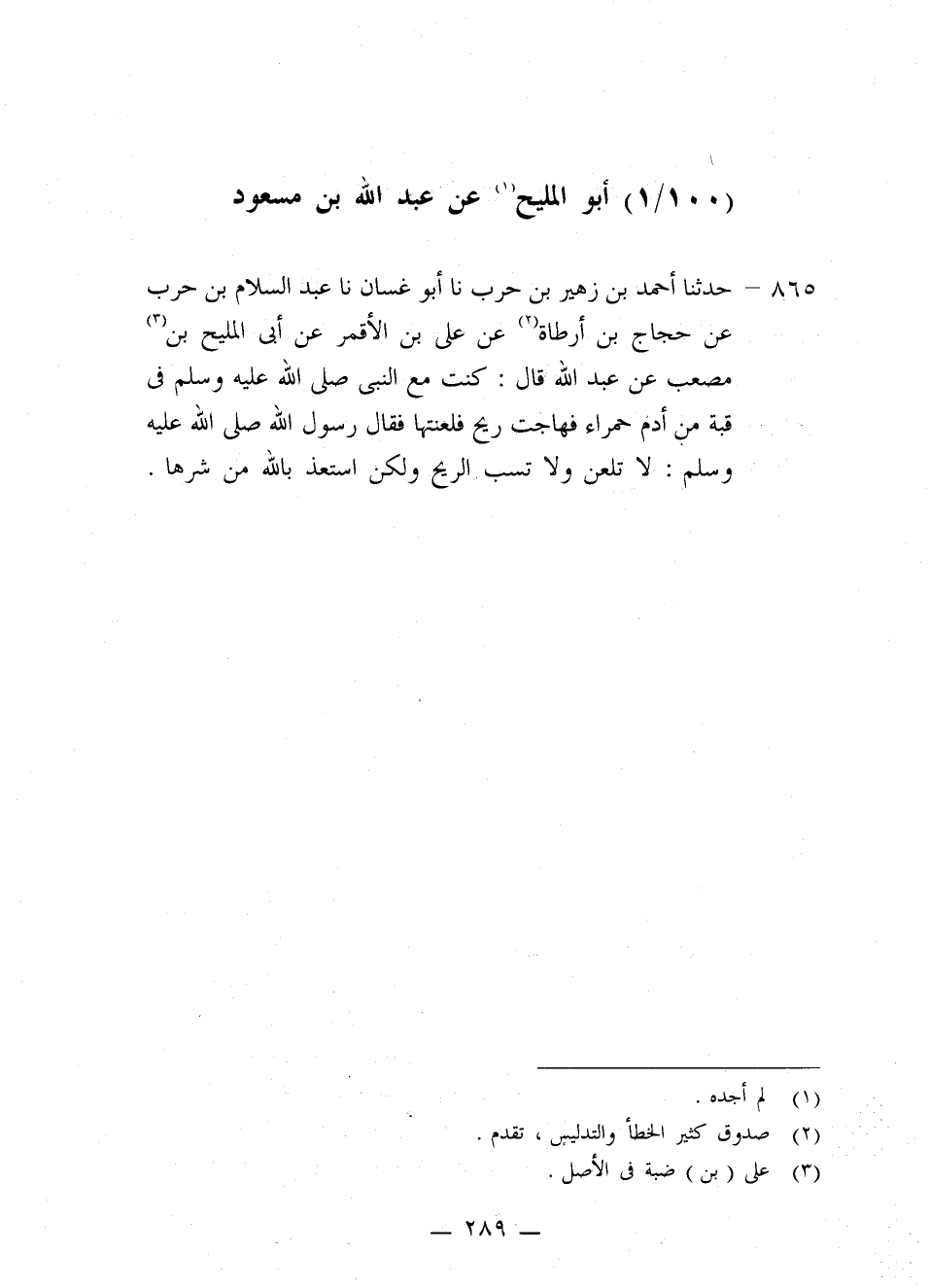 865 - حَدَّثَنَا أَحْمَدُ بْنُ زُهَيْرِ بْنِ حَرْبٍ، نا أَبُو غَسَّانَ، نا عَبْدُ السَّلَامِ بْنُ حَرْبٍ، عَنْ حَجَّاجِ بْنِ أَرْطَأَةَ، عَنْ عَلِيِّ بْنِ الْأَقْمَرِ بْنِ أَبِي الْمَلِيحِ بْنِ مُصْعَبٍ، عَنْ عَبْدِ اللَّهِ قَالَ: كُنْتُ مَعَ النَّبِيِّ صَلَّى اللهُ عَلَيْهِ وَسَلَّمَ فِي قُبَّةٍ مِنْ أَدَمٍ حَمْرَاءَ، فَهَاجَتْ رِيحٌ فَلَعَنْتُهَا، فَقَالَ رَسُولُ اللَّهِ صَلَّى اللهُ عَلَيْهِ وَسَلَّمَ: «§لَا تَلْعَنْ وَلَا تَسُبَّ الرِّيحَ، وَلَكِنِ اسْتَعِذْ بِاللَّهِ مِنْ شَرِّهَا»