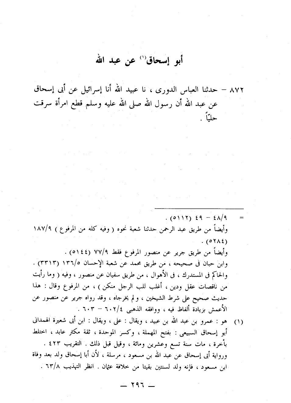 872 - حَدَّثَنَا الْعَبَّاسُ الدُّورِيُّ، نا عُبَيْدُ اللَّهِ، أنا إِسْرَائِيلُ، عَنْ أَبِي إِسْحَاقَ، عَنْ عَبْدِ اللَّهِ، أَنَّ رَسُولَ اللَّهِ صَلَّى اللهُ عَلَيْهِ وَسَلَّمَ «§قَطَعَ يَدَ امْرَأَةٍ سَرَقَتْ حُلِيًّا»