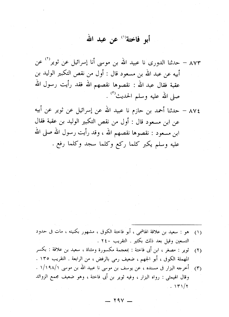 873 - حَدَّثَنَا الدُّورِيُّ، نا عُبَيْدُ اللَّهِ بْنُ مُوسَى، أنا إِسْرَائِيلُ، عَنْ ثُوَيْرٍ، عَنْ أَبِيهِ، عَنْ عَبْدِ اللَّهِ بْنِ مَسْعُودٍ قَالَ: أَوَّلُ مَنْ نَقَصَ التَّكْبِيرَ الْوَلِيدُ بْنُ عُقْبَةَ، فَقَالَ عَبْدُ اللَّهِ: نَقَصُوهَا نَقَصَهُمُ اللَّهَ، فَقَدْ رَأَيْتُ رَسُولَ اللَّهِ صَلَّى اللهُ عَلَيْهِ وَسَلَّمَ الْحَدِيثَ.