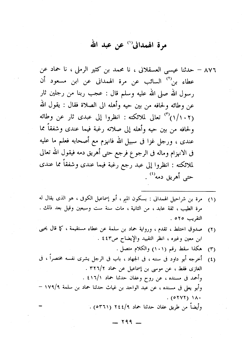 876 - حَدَّثَنَا عِيسَى الْعَسْقَلَانِيُّ، نا مُحَمَّدُ بْنُ كَثِيرٍ الرَّمْلِيُّ، نا حَمَّادٌ، عَنْ عَطَاءِ بْنِ السَّائِبِ، عَنْ مُرَّةَ الْهَمْدَانِيِّ، عَنِ ابْنِ مَسْعُودٍ، أَنَّ رَسُولَ اللَّهِ صَلَّى اللهُ عَلَيْهِ وَسَلَّمَ قَالَ: " §عَجِبَ رَبُّنَا مِنْ رَجُلَيْنِ: رَجُلٌ ثَارَ عَنْ وِطَائِهِ وَلِحَافِهِ مِنْ بَيْنِ حَيِّهِ وَأَهْلِهِ إِلَى الصَّلَاةِ، فَقَالَ: يَقُولُ اللَّهُ تَعَالَى لِمَلَائِكَتِهِ: «انْظُرُوا إِلَى عَبْدِي ثَارَ عَنْ وِطَائِهِ وَلِحَافِهِ مِنْ بَيْنِ حَيِّهِ وَأَهْلِهِ إِلَى صَلَاتِهِ رَغْبَةً فِيمَا عِنْدِي وَشَفَقًا مِمَّا عِنْدِي» ، وَرَجُلٌ غَزَا فِي سَبِيلِ اللَّهِ فَانْهَزَمَ مَعَ أَصْحَابِهِ، فَعَلِمَ مَا عَلَيْهِ فِي الِانْهِزَامِ، وَمَالَهُ فِي الرُّجُوعِ، فَرَجَعَ حَتَّى أُهْرِيقَ دَمُهُ، فَيَقُولُ اللَّهُ تَعَالَى لِمَلَائِكَتِهِ: «انْظُرُوا إِلَى عَبْدٍ رَجَعَ رَغْبَةً فِيمَا عِنْدِي وَشَفَقًا مِمَّا عِنْدِي حَتَّى أُهْرِيقَ دَمُهُ»