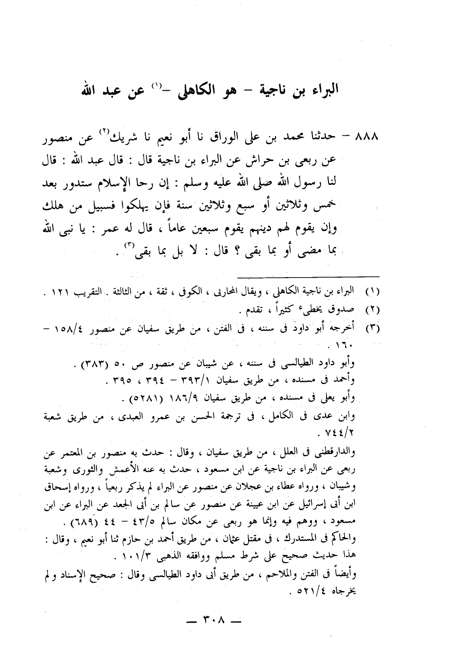 888 - حَدَّثَنَا مُحَمَّدُ بْنُ عَلِيٍّ الْوَرَّاقُ، نا أَبُو نُعَيْمٍ، نا شَرِيكٌ، عَنْ مَنْصُورٍ، عَنْ رِبْعِيِّ بْنِ حِرَاشٍ، عَنِ الْبَرَاءِ بْنِ نَاجِيَةَ قَالَ: قَالَ عَبْدُ اللَّهِ: قَالَ لَنَا رَسُولُ اللَّهِ صَلَّى اللهُ عَلَيْهِ وَسَلَّمَ: «إِنَّ §رَحَا الْإِسْلَامِ سَتَدُورُ بَعْدَ خَمْسٍ وَثَلَاثِينَ - أَوْ سَبْعٍ وَثَلَاثِينَ - سَنَةً فَإِنْ يَهْلِكُوا فَسَبِيلُ مَنْ هَلَكَ، وَإِنْ يَقُومُ لَهُمْ دِينُهُمْ يَقُومُ سَبْعِينَ عَامًا» قَالَ لَهُ عُمَرُ: يَا نَبِيَّ اللَّهِ، بِمَا مَضَى أَوْ بِمَا بَقِيَ؟ قَالَ: «لَا، بَلْ بِمَا بَقِيَ»