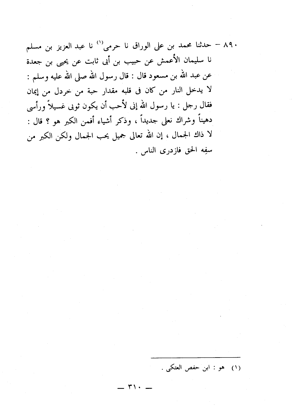 890 - حَدَّثَنَا مُحَمَّدُ بْنُ عَلِيٍّ الْوَرَّاقُ، نا حَرَمِيٌّ، نا عَبْدُ الْعَزِيزِ بْنُ مُسْلِمٍ، نا سُلَيْمَانُ الْأَعْمَشُ، عَنْ حَبِيبِ بْنِ أَبِي ثَابِتٍ، عَنْ يَحْيَى بْنِ جَعْدَةَ، عَنْ عَبْدِ اللَّهِ بْنِ مَسْعُودٍ قَالَ: قَالَ رَسُولُ اللَّهِ صَلَّى اللهُ عَلَيْهِ وَسَلَّمَ: «§لَا يَدْخُلُ النَّارَ مَنْ كَانَ فِي قَلْبِهِ مِقْدَارُ حَبَّةٍ مِنْ خَرْدَلٍ مِنْ إِيمَانٍ» ، فَقَالَ رَجُلٌ: يَا رَسُولَ اللَّهِ، إِنِّي لَأُحِبُّ أَنْ يَكُونَ ثَوْبِي غَسِيلًا، وَرَأْسِي دَهِينًا، وَشِرَاكُ نَعْلِي جَدِيدًا، وَذَكَرَ أَشْيَاءَ، أَفَمِنَ الْكِبْرِ هُوَ؟ قَالَ: «لَا، ذَاكَ الْجَمَالُ؛ إِنَّ اللَّهَ تَعَالَى جَمِيلٌ يُحِبُّ الْجَمَالَ، وَلَكِنَّ الْكِبْرَ مَنْ سَفِهَ الْحَقَّ فَازْدَرَى النَّاسَ»