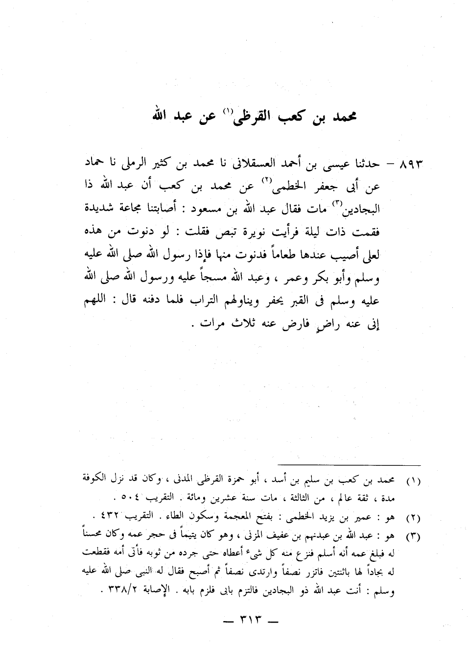 893 - حَدَّثَنَا عِيسَى بْنُ أَحْمَدَ الْعَسْقَلَانِيُّ، نا مُحَمَّدُ بْنُ كَثِيرٍ الرَّمْلِيُّ، نا حَمَّادٌ، عَنْ أَبِي جَعْفَرٍ الْخَطْمِيِّ، عَنْ مُحَمَّدِ بْنِ كَعْبٍ، أَنَّ عَبْدَ اللَّهِ ذَا الْبِجَادَيْنِ مَاتَ، فَقَالَ عَبْدُ اللَّهِ بْنُ مَسْعُودٍ: أَصَابَتْنَا مَجَاعَةٌ شَدِيدَةٌ، فَقُمْتُ ذَاتَ لَيْلَةٍ فَرَأَيْتُ نُوَيْرَةَ تَبُصُّ، فَقُلْتُ: لَوْ دَنَوْتُ مِنْ هَذِهِ؛ لَعَلِّي أُصِيبُ عِنْدَهَا طَعَامًا، فَدَنَوْتُ مِنْهَا فَإِذَا رَسُولُ اللَّهِ صَلَّى اللهُ عَلَيْهِ وَسَلَّمَ وَأَبُو بَكْرٍ وَعُمَرُ، وَعَبْدُ اللَّهِ مُسَجًّى عَلَيْهِ، وَرَسُولُ اللَّهِ صَلَّى اللهُ عَلَيْهِ وَسَلَّمَ فِي الْقَبْرِ يَحْفِرُ وَيُنَاوِلُهُمُ التُّرَابَ فَلَمَّا دَفَنَهُ قَالَ: «§اللَّهُمَّ إِنِّي عَنْهُ رَاضٍ فَارْضَ عَنْهُ ثَلَاثَ مَرَّاتٍ»