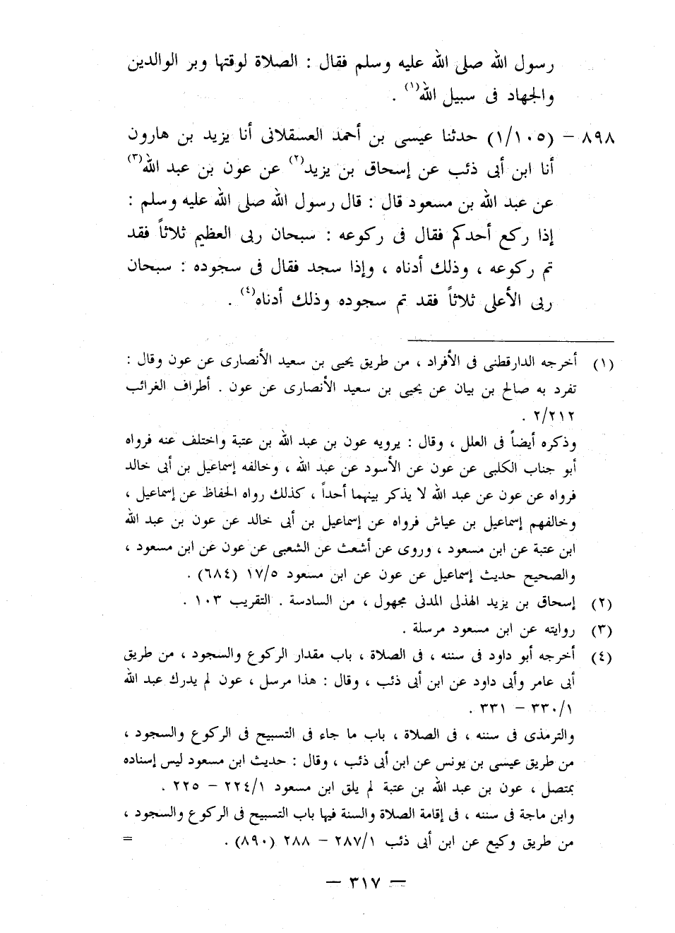 898 - حَدَّثَنَا عِيسَى بْنُ أَحْمَدَ الْعَسْقَلَانِيُّ، أنا يَزِيدُ بْنُ هَارُونَ، أنا ابْنُ أَبِي ذِئْبٍ، عَنْ إِسْحَاقَ بْنِ يَزِيدَ، عَنْ عَوْنِ بْنِ عَبْدِ اللَّهِ، عَنْ عَبْدِ اللَّهِ بْنِ مَسْعُودٍ قَالَ: قَالَ رَسُولُ اللَّهِ صَلَّى اللهُ عَلَيْهِ وَسَلَّمَ: " §إِذَا رَكَعَ أَحَدُكُمْ فَقَالَ فِي رُكُوعِهِ: سُبْحَانَ رَبِّيَ الْعَظِيمِ ثَلَاثًا فَقَدْ تَمَّ رُكُوعُهُ، وَذَلِكَ أَدْنَاهُ، وَإِذَا سَجَدَ فَقَالَ فِي سُجُودِهِ: سُبْحَانَ رَبِّيَ الْأَعْلَى ثَلَاثًا فَقَدْ تَمَّ سُجُودُهُ، وَذَلِكَ أَدْنَاهُ "