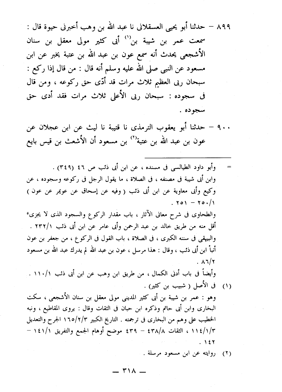 899 - حَدَّثَنَا أَبُو يَحْيَى الْعَسْقَلَانِيُّ، نا عَبْدُ اللَّهِ بْنُ وَهْبٍ، أَخْبَرَنِي حَيْوَةُ قَالَ: سَمِعْتُ عُمَرَ بْنَ شَيْبَةَ بْنَ أَبِي كَثِيرٍ مَوْلَى مَعْقِلِ بْنِ سِنَانٍ الْأَشْجَعِيِّ يُحَدِّثُ، أَنَّهُ سَمِعَ عَوْنَ بْنَ عَبْدِ اللَّهِ بْنِ عُتْبَةَ، يُخْبِرُ، عَنِ ابْنِ مَسْعُودٍ، عَنِ النَّبِيِّ صَلَّى اللهُ عَلَيْهِ وَسَلَّمَ، أَنَّهُ قَالَ: " §مَنْ قَالَ إِذَا رَكَعَ: سُبْحَانَ رَبِّيَ الْعَظِيمِ ثَلَاثَ مَرَّاتٍ قَدْ أَدَّى حَقَّ رُكُوعِهِ، وَمَنْ قَالَ فِي سُجُودِهِ: سُبْحَانَ رَبِّيَ الْأَعْلَى ثَلَاثَ مَرَّاتٍ فَقَدْ أَدَّى حَقَّ سُجُودِهِ "