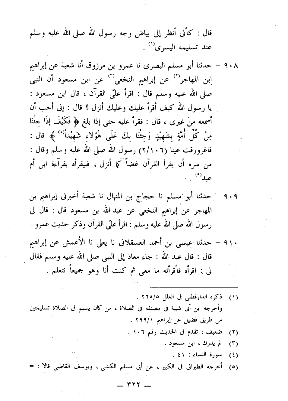 908 - حَدَّثَنَا أَبُو مُسْلِمٍ الْبَصْرِيُّ، نا عَمْرُو بْنُ مَرْزُوقٍ، أنا شُعْبَةُ، عَنْ إِبْرَاهِيمَ بْنِ الْمُهَاجِرِ، عَنْ إِبْرَاهِيمَ النَّخَعِيِّ، عَنِ ابْنِ مَسْعُودٍ، أَنَّ النَّبِيَّ صَلَّى اللهُ عَلَيْهِ وَسَلَّمَ قَالَ: «اقْرَأْ عَلَيَّ الْقُرْآنَ» قَالَ ابْنُ مَسْعُودٍ: يَا رَسُولَ اللَّهِ، كَيْفَ أَقْرَأُ عَلَيْكَ وَعَلَيْكَ أُنْزِلَ؟ قَالَ: «§إِنِّي أُحِبُّ أَنْ أَسْمَعَهُ مِنْ غَيْرِي» قَالَ: فَقَرَأَ عَلَيْهِ حَتَّى إِذَا بَلَغَ {فَكَيْفَ إِذَا جِئْنَا مِنْ كُلِّ أُمَّةٍ بِشَهِيدٍ وَجِئْنَا بِكَ عَلَى هَؤُلَاءِ شَهِيدًا} [النساء: 41] قَالَ: فَاغْرَوْرَقَتْ عَيْنا رَسُولِ اللَّهِ صَلَّى اللهُ عَلَيْهِ وَسَلَّمَ، وَقَالَ: «مَنْ سَرَّهُ أَنْ يَقْرَأَ الْقُرْآنَ غَضًّا كَمَا أُنْزِلَ فَلْيَقْرَأْهُ بِقِرَاءَةِ ابْنِ أُمِّ عَبْدٍ»