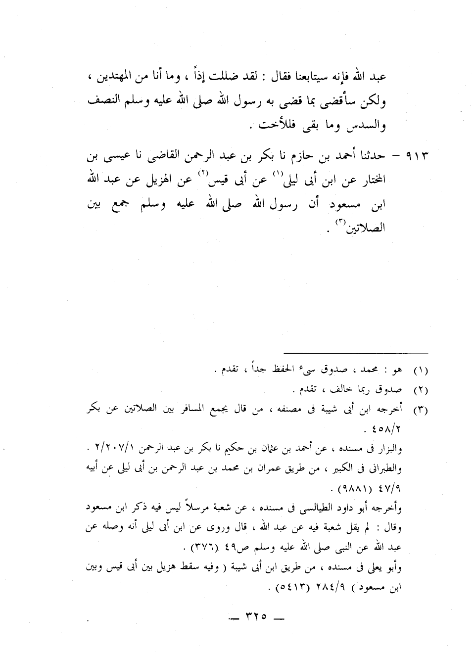 913 - حَدَّثَنَا أَحْمَدُ بْنُ حَازِمٍ، نا بَكْرُ بْنُ عَبْدِ الرَّحْمَنِ الْقَاضِي، نا عِيسَى بْنُ الْمُخْتَارِ، عَنِ ابْنِ أَبِي لَيْلَى، عَنْ أَبِي قَيْسٍ، عَنِ الْهُزَيْلِ، عَنْ عَبْدِ اللَّهِ بْنِ مَسْعُودٍ، أَنَّ رَسُولَ اللَّهِ صَلَّى اللهُ عَلَيْهِ وَسَلَّمَ §جَمَعَ بَيْنَ الصَّلَاتَيْنِ