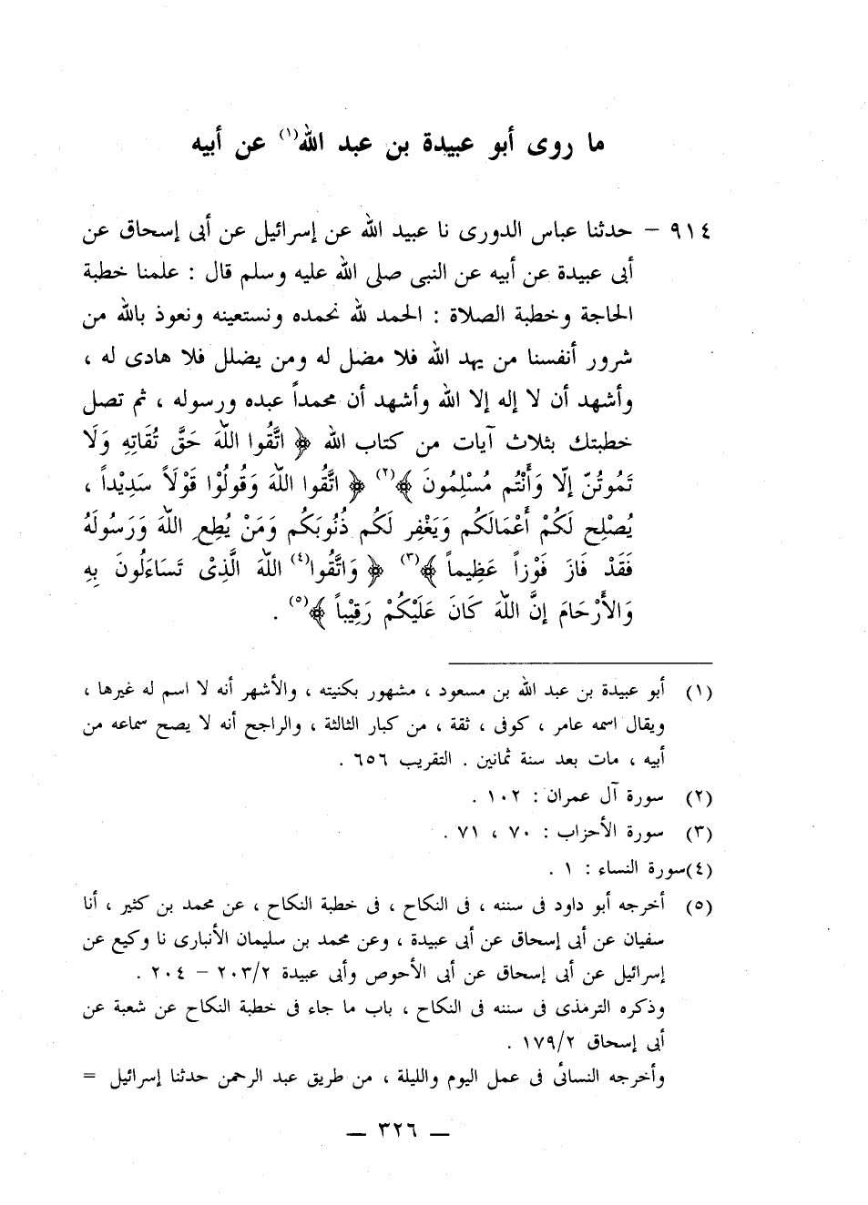 914 - حَدَّثَنَا عَبَّاسٌ الدُّورِيُّ، نا عُبَيْدُ اللَّهِ، عَنْ إِسْرَائِيلَ، عَنْ أَبِي إِسْحَاقَ، عَنْ أَبِي عُبَيْدَةَ، عَنْ أَبِيهِ، عَنِ النَّبِيِّ صَلَّى اللهُ عَلَيْهِ وَسَلَّمَ قَالَ: §عَلَّمَنَا خُطْبَةَ الْحَاجَةِ وَخُطْبَةَ الصَّلَاةِ: «الْحَمْدُ لِلَّهِ نَحْمَدُهُ وَنَسْتَعِينُهُ، وَنَعُوذُ بِاللَّهِ مِنْ شُرُورِ أَنْفُسِنَا، مَنْ يَهْدِ اللَّهُ فَلَا مُضِلَّ لَهُ، وَمَنْ يُضْلِلْ فَلَا هَادِيَ لَهُ، وَأَشْهَدُ أَنَّ لَا إِلَهَ إِلَّا اللَّهُ، وَأَشْهَدُ أَنَّ مُحَمَّدًا عَبْدُهُ وَرَسُولُهُ» ، ثُمَّ تَصِلْ خُطْبَتَكَ بِثَلَاثِ آيَاتٍ مِنْ كِتَابِ اللَّهِ {اتَّقُوا اللَّهَ حَقَّ تُقَاتِهِ وَلَا تَمُوتُنَّ إِلَّا وَأَنْتُمْ مُسْلِمُونَ} [آل عمران: 102] ، {اتَّقُوا اللَّهَ وَقُولُوا قَوْلًا سَدِيدًا يَصْلُحْ لَكُمْ أَعْمَالَكُمْ وَيَغْفِرْ لَكُمْ ذُنُوبَكُمْ وَمَنْ يُطِعِ اللَّهَ وَرَسُولَهُ فَقَدْ فَازَ فَوْزًا عَظِيمًا} [الأحزاب: 71] ، {وَاتَّقُوا اللَّهَ الَّذِي تَسَاءَلُونَ بِهِ وَالْأَرْحَامَ إِنَّ اللَّهَ كَانَ عَلَيْكُمْ رَقِيبًا} [النساء: 1]