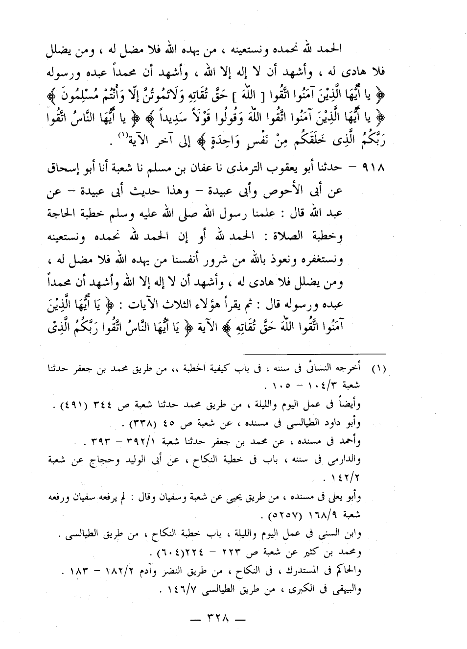 918 - حَدَّثَنَا أَبُو يَعْقُوبَ التِّرْمِذِيُّ، نا عَفَّانُ بْنُ مُسْلِمٍ، نا شُعْبَةُ، أنا أَبُو إِسْحَاقَ، عَنْ أَبِي الْأَحْوَصِ، وَأَبِي عُبَيْدَةَ وَهَذَا حَدِيثُ أَبِي عُبَيْدَةَ، عَنْ عَبْدِ اللَّهِ قَالَ: §عَلَّمَنَا رَسُولُ اللَّهِ صَلَّى اللهُ عَلَيْهِ وَسَلَّمَ خُطْبَةَ الْحَاجَةِ وَخُطْبَةَ الصَّلَاةِ، " الْحَمْدُ لِلَّهِ - أَوْ إِنَّ الْحَمْدَ لِلَّهِ - نَحْمَدُهُ وَنَسْتَعِينُهُ وَنَسْتَغْفِرُهُ، وَنَعُوذُ بِاللَّهِ مِنْ شُرُورِ أَنْفُسِنَا، مَنْ يَهْدِهِ اللَّهُ فَلَا مُضِلَّ لَهُ، وَمَنْ يُضْلِلْ فَلَا هَادِيَ لَهُ، وَأَشْهَدُ أَنَّ لَا إِلَهَ إِلَّا اللَّهُ، وَأَشْهَدُ أَنَّ مُحَمَّدًا عَبْدُهُ وَرَسُولُهُ قَالَ: ثُمَّ يَقْرَأُ هَؤُلَاءِ الثَّلَاثَ الْآيَاتِ {يَا أَيُّهَا الَّذِينَ آمَنُوا اتَّقُوا اللَّهَ حَقَّ تُقَاتِهِ} [آل عمران: 102] الْآيَةَ، {يَا أَيُّهَا النَّاسُ اتَّقُوا رَبَّكُمُ الَّذِي خَلَقَكُمْ مِنْ نَفْسٍ وَاحِدَةٍ} [النساء: 1]