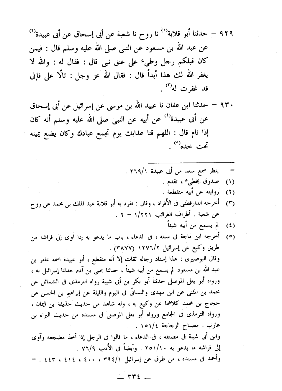 929 - حَدَّثَنَا أَبُو قِلَابَةَ، نا رَوْحٌ، نا شُعْبَةُ، عَنْ أَبِي إِسْحَاقَ، عَنْ أَبِي عُبَيْدَةَ، عَنْ عَبْدِ اللَّهِ بْنِ مَسْعُودٍ، عَنِ النَّبِيِّ صَلَّى اللهُ عَلَيْهِ وَسَلَّمَ قَالَ: " §فِيمَنْ كَانَ قَبْلَكُمْ رَجُلٌ وَطِئَ عَلَى عُنُقِ نَبِيٍّ قَالَ: فَقَالَ لَهُ: وَاللَّهِ لَا يَغْفِرُ اللَّهُ لَكَ هَذَا أَبَدًا قَالَ: فَقَالَ اللَّهُ عَزَّ وَجَلَّ: تَأَلَّى عَلَيَّ، فَإِنِّي قَدْ غَفَرْتُ لَهُ
