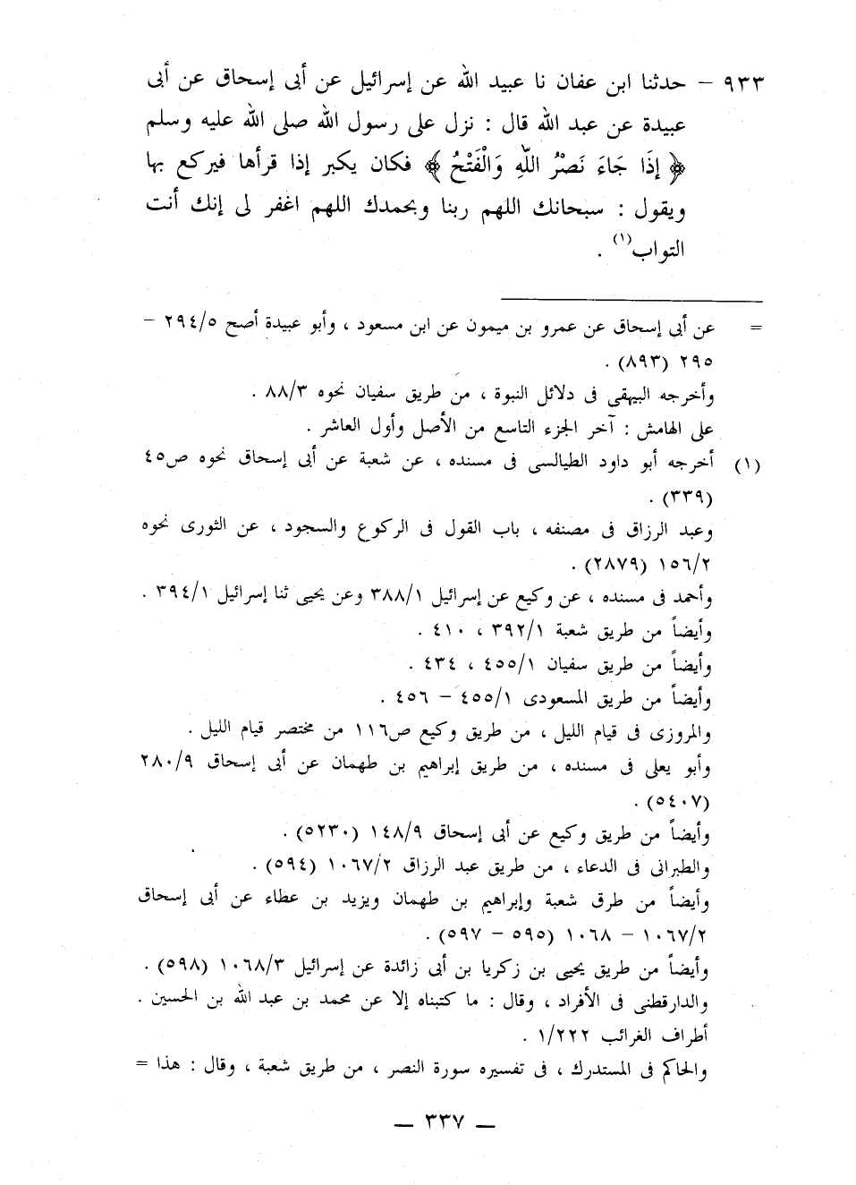 933 - حَدَّثَنَا ابْنُ عَفَّانَ، نا عُبَيْدُ اللَّهِ، عَنْ إِسْرَائِيلَ، عَنْ أَبِي إِسْحَاقَ، عَنْ أَبِي عُبَيْدَةَ، عَنْ عَبْدِ اللَّهِ قَالَ: نَزَلَ عَلَى رَسُولِ اللَّهِ صَلَّى اللهُ عَلَيْهِ وَسَلَّمَ {إِذَا جَاءَ نَصْرُ اللَّهِ وَالْفَتْحُ} [النصر: 1] ، فَكَانَ يُكَبِّرُ إِذَا قَرَأَهَا فَيَرْكَعُ بِهَا وَيَقُولُ: «§سُبْحَانَكَ اللَّهُمَّ رَبَّنَا وَبِحَمْدِكَ، اللَّهُمَّ اغْفِرْ لِي؛ إِنَّكَ أَنْتَ التَّوَّابُ»