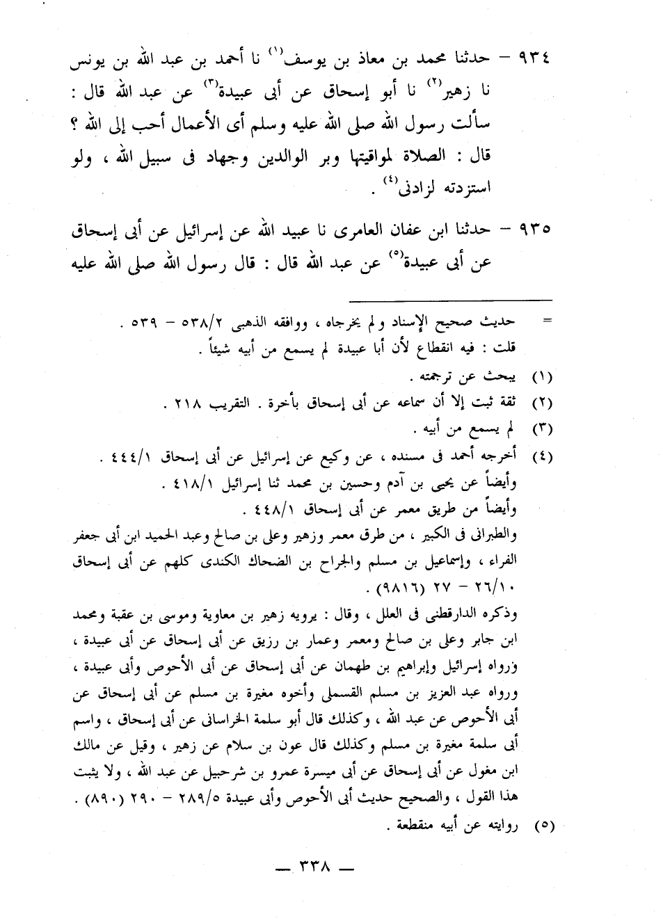 934 - حَدَّثَنَا مُحَمَّدُ بْنُ مُعَاذِ بْنِ يُوسُفَ، نا أَحْمَدُ بْنُ عَبْدِ اللَّهِ بْنِ يُونُسَ، نا زُهَيْرٌ، نا أَبُو إِسْحَاقَ، عَنْ أَبِي عُبَيْدَةَ، عَنْ عَبْدِ اللَّهِ قَالَ: سَأَلْتُ رَسُولَ اللَّهِ صَلَّى اللَّهُ عَلَيْهِ وَسَلَّمَ: §أَيُّ الْأَعْمَالِ أَحَبُّ إِلَى اللَّهِ؟ قَالَ: «الصَّلَاةُ لِمَوَاقِيتِهَا وَبِرُّ الْوَالِدَيْنِ وَجِهَادٌ فِي سَبِيلِ اللَّهِ، وَلَوِ اسْتَزَدْتُهُ لَزَادَنِي»