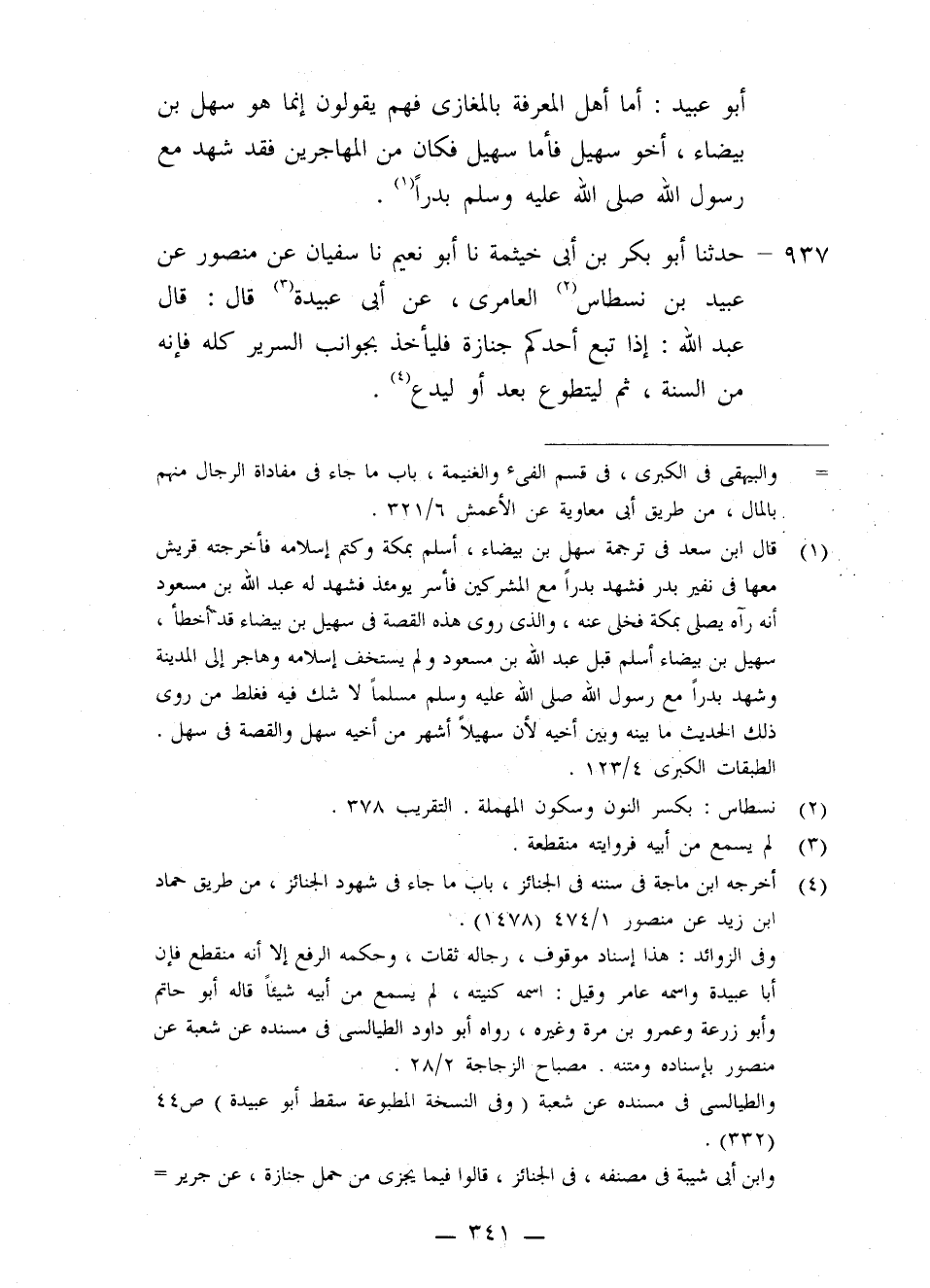 937 - حَدَّثَنَا أَبُو بَكْرِ بْنُ أَبِي خَيْثَمَةَ، نا أَبُو نُعَيْمٍ، نا سُفْيَانُ، عَنْ مَنْصُورٍ، عَنْ عُبَيْدِ بْنِ نِسْطَاسٍ الْعَامِرِيِّ، عَنْ أَبِي عُبَيْدَةَ قَالَ: قَالَ عَبْدُ اللَّهِ: «§إِذَا تَبِعَ أَحَدُكُمْ جَنَازَةً فَلْيَأْخُذْ بِجَوَانِبِ السَّرِيرِ كُلِّهِ؛ فَإِنَّهُ مِنَ السُّنَّةِ، ثُمَّ لْيَتَطَوَّعْ بَعْدُ أَوْ لِيَدَعْ»