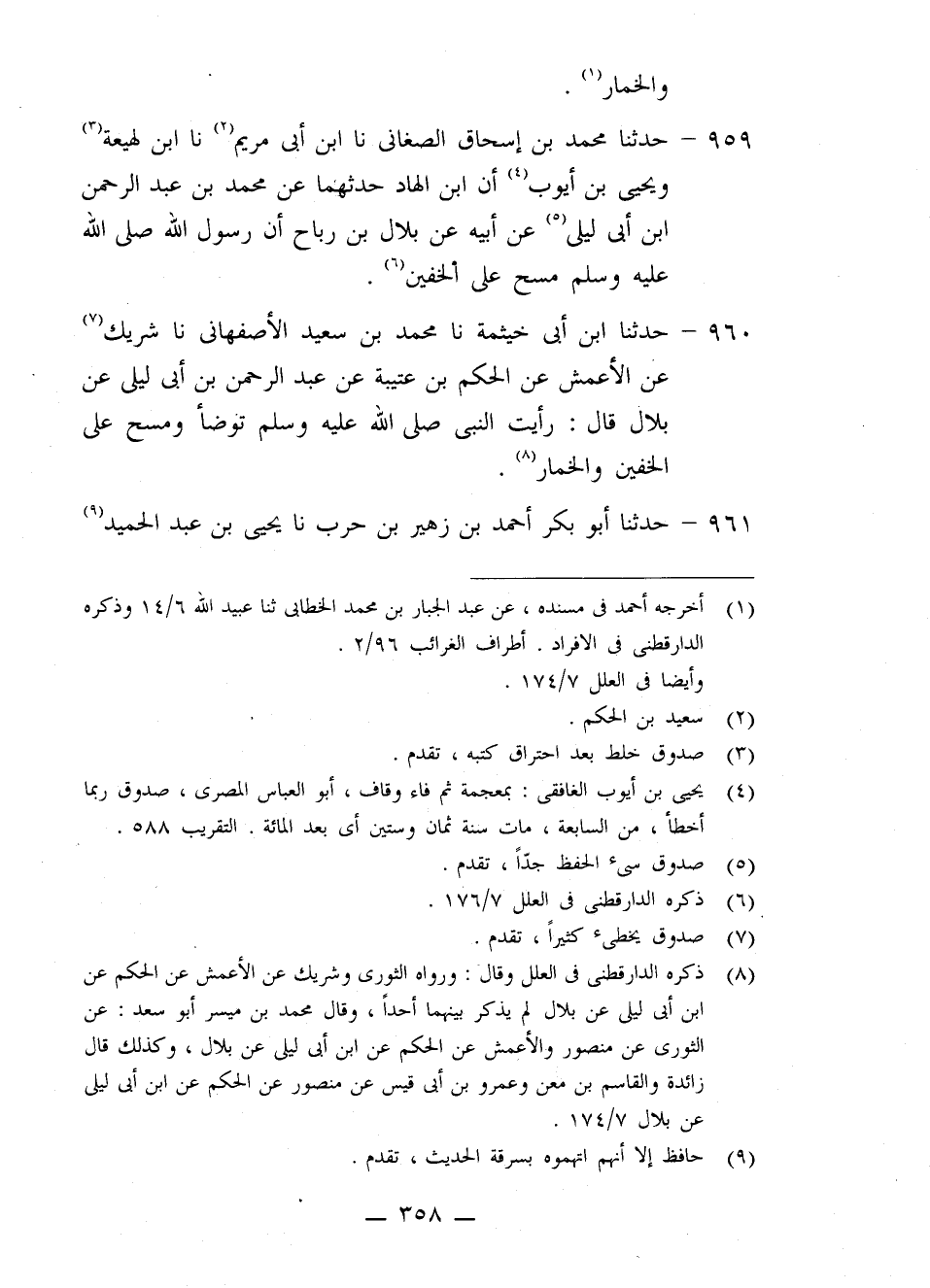 960 - حَدَّثَنَا ابْنُ أَبِي خَيْثَمَةَ، نا مُحَمَّدُ بْنُ سَعِيدٍ الْأَصْفَهَانِيُّ، نا شَرِيكٌ، عَنِ الْأَعْمَشِ، عَنِ الْحَكَمِ بْنِ عُتَيْبَةَ، عَنْ عَبْدِ الرَّحْمَنِ بْنِ أَبِي لَيْلَى، عَنْ بِلَالٍ قَالَ: رَأَيْتُ النَّبِيَّ صَلَّى اللهُ عَلَيْهِ وَسَلَّمَ §تَوَضَّأَ وَمَسَحَ عَلَى الْخُفَّيْنِ وَالْخِمَارِ