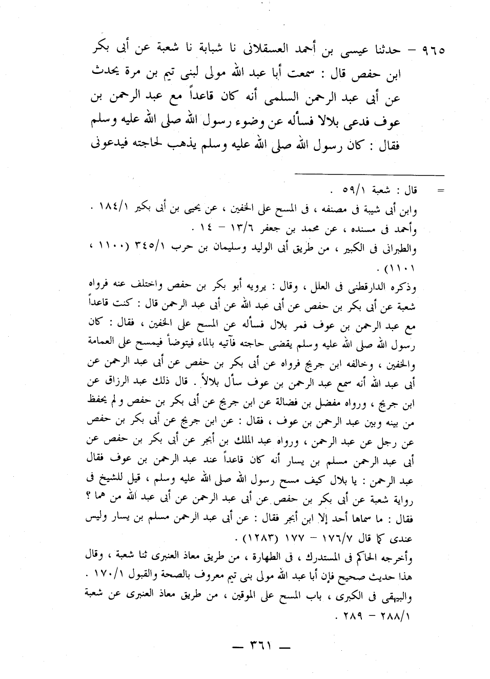 965 - حَدَّثَنَا عِيسَى بْنُ أَحْمَدَ الْعَسْقَلَانِيُّ، نا شَبَابَةُ، نا شُعْبَةُ، عَنْ أَبِي بَكْرِ بْنِ حَفْصٍ قَالَ: سَمِعْتُ أَبَا عَبْدِ اللَّهِ، مَوْلًى لِبَنِي تَيْمِ بْنِ مُرَّةَ يُحَدِّثُ، عَنْ أَبِي عَبْدِ الرَّحْمَنِ السُّلَمِيِّ، أَنَّهُ كَانَ قَاعِدًا مَعَ عَبْدِ الرَّحْمَنِ بْنِ عَوْفٍ، فَدَعَا بِلَالًا فَسَأَلَهُ عَنْ وُضُوءِ رَسُولِ اللَّهِ صَلَّى اللهُ عَلَيْهِ وَسَلَّمَ فَقَالَ: كَانَ رَسُولُ اللَّهِ صَلَّى اللَّهُ عَلَيْهِ §يَذْهَبُ لِحَاجَتِهِ، فَيَدْعُونِي -[362]- بِالْمَاءِ، فَيَتَوَضَّأُ فَيَمْسَحُ عَلَى الْمُوقَيْنِ وَالْعِمَامَةِ، أَوِ الْخُفَّيْنِ وَالْعِمَامَةِ