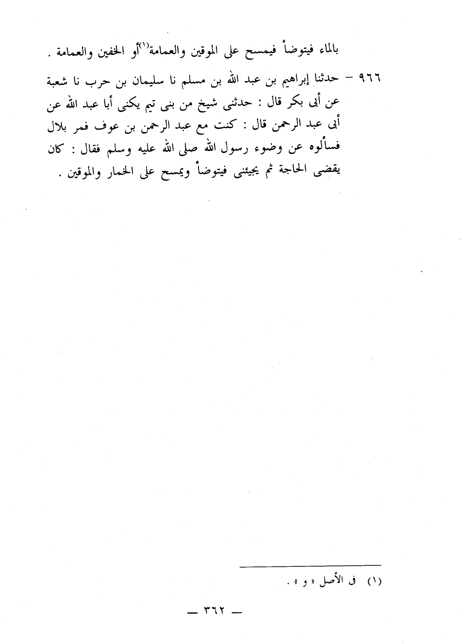 966 - حَدَّثَنَا إِبْرَاهِيمُ بْنُ عَبْدِ اللَّهِ بْنِ مُسْلِمٍ، نا سُلَيْمَانُ بْنُ حَرْبٍ، نا شُعْبَةُ، عَنْ أَبِي بَكْرٍ قَالَ: حَدَّثَنِي شَيْخٌ، مِنْ بَنِي تَيْمٍ يُكْنَى أَبَا عَبْدِ اللَّهِ، عَنْ أَبِي عَبْدِ الرَّحْمَنِ قَالَ: كُنْتُ مَعَ عَبْدِ الرَّحْمَنِ بْنِ عَوْفٍ، فَمَرَّ بِلَالٌ فَسَأَلُوهُ عَنْ وُضُوءِ رَسُولِ اللَّهِ صَلَّى اللهُ عَلَيْهِ وَسَلَّمَ، فَقَالَ: كَانَ §يَقْضِي الْحَاجَةَ، ثُمَّ يَجِيئُنِي فَيَتَوَضَّأُ وَيَمْسَحُ عَلَى الْخِمَارِ وَالْمُوقَيْنِ