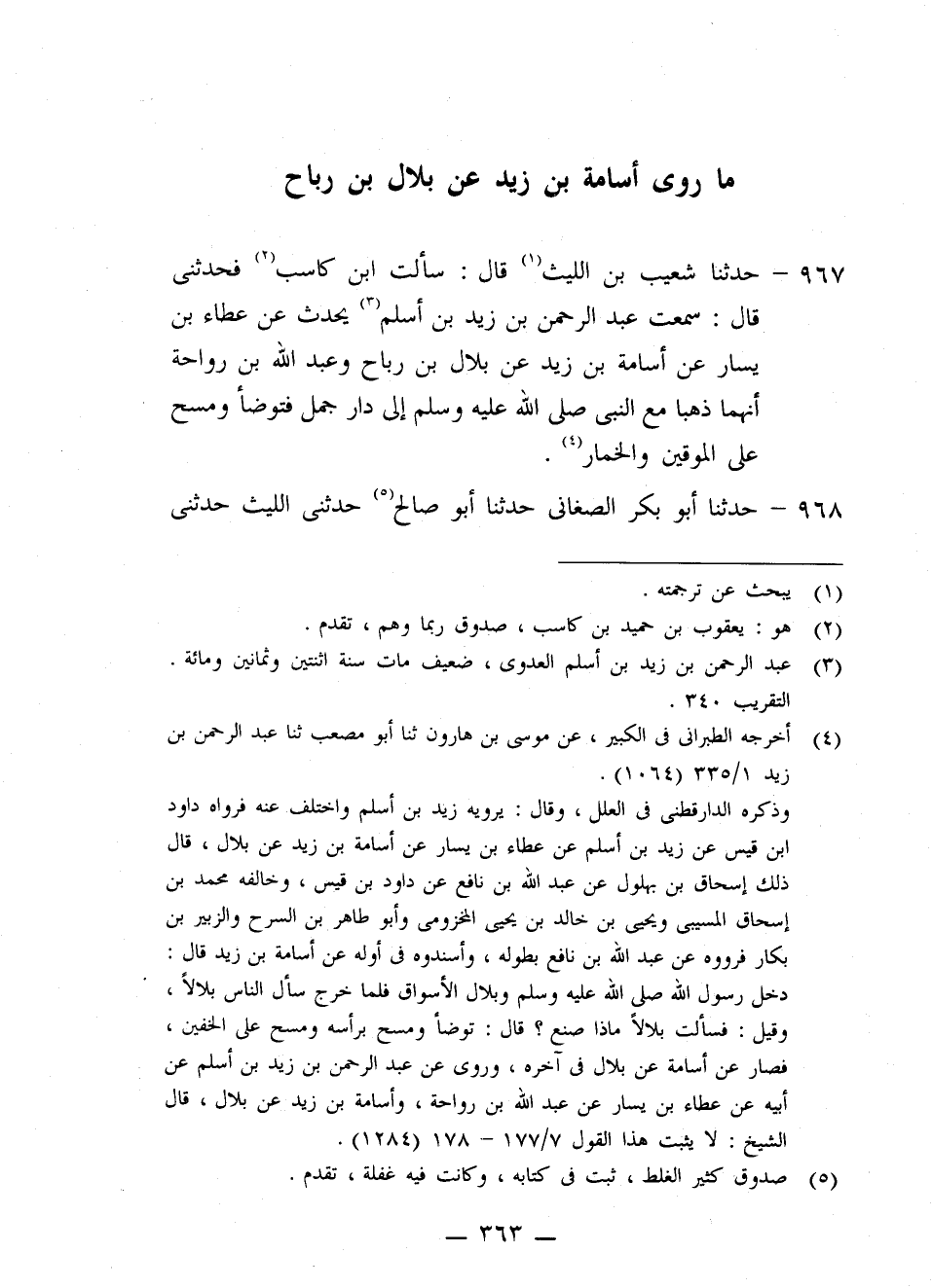 967 - حَدَّثَنَا شُعَيْبُ بْنُ اللَّيْثِ قَالَ: سَأَلْتُ ابْنَ كَاسِبٍ، فَحَدَّثَنِي قَالَ: سَمِعْتُ عَبْدَ الرَّحْمَنِ بْنَ زَيْدِ بْنِ أَسْلَمَ، يُحَدِّثُ، عَنْ عَطَاءِ بْنِ يَسَارٍ، عَنْ أُسَامَةَ بْنِ زَيْدٍ، عَنْ بِلَالِ بْنِ رَبَاحٍ، وَعَبْدِ اللَّهِ بْنِ رَوَاحَةَ، أَنَّهُمَا ذَهَبَا مَعَ النَّبِيِّ صَلَّى اللهُ عَلَيْهِ وَسَلَّمَ إِلَى دَارِ جَمَلٍ، §فَتَوَضَّأَ وَمَسَحَ عَلَى الْمُوقَيْنِ وَالْخِمَارِ