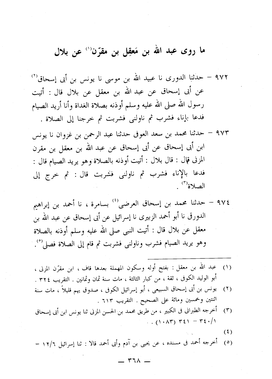 973 - حَدَّثَنَا مُحَمَّدُ بْنُ سَعْدٍ الْعَوْفِيُّ، حَدَّثَنَا عَبْدُ الرَّحْمَنِ بْنُ غَزْوَانَ، نا يُونُسُ بْنُ أَبِي إِسْحَاقَ، عَنْ أَبِي إِسْحَاقَ، عَنْ عَبْدِ اللَّهِ بْنِ مَعْقِلِ بْنِ مُقَرِّنٍ الْمُزَنِيِّ قَالَ: قَالَ بِلَالٌ: «أَتَيْتُ أُوذِنُهُ بِالصَّلَاةِ وَهُوَ يُرِيدُ الصِّيَامَ» قَالَ: «§فَدَعَا بِالْإِنَاءِ فَشَرِبَ، ثُمَّ نَاوَلَنِي فَشَرِبْتُ» قَالَ: «ثُمَّ خَرَجَ إِلَى الصَّلَاةِ»