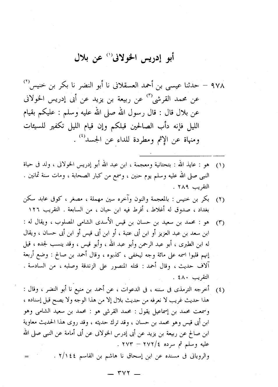 978 - حَدَّثَنَا عِيسَى بْنُ أَحْمَدَ الْعَسْقَلَانِيُّ، نا أَبُو النَّضْرِ، نا بَكْرُ بْنُ خُنَيْسٍ، عَنْ مُحَمَّدٍ الْقُرَشِيِّ، عَنْ رَبِيعَةَ بْنِ يَزِيدَ، عَنْ أَبِي إِدْرِيسَ الْخَوْلَانِيِّ، عَنْ بِلَالٍ قَالَ: قَالَ رَسُولُ اللَّهِ صَلَّى اللَّهُ وَسَلَّمَ: «§عَلَيْكُمْ بِقِيَامِ اللَّيْلِ؛ فَإِنَّهُ دَأَبُ الصَّالِحِينَ قَبْلَكُمْ، وَإِنَّ قِيَامَ اللَّيْلِ تَكْفِيرٌ لِلسَّيِّئَاتِ، وَمَنْهَاةٌ عَنِ الْإِثْمِ، وَمَطْرَدَةٌ لِلدَّاءِ عَنِ الْجَسَدِ»